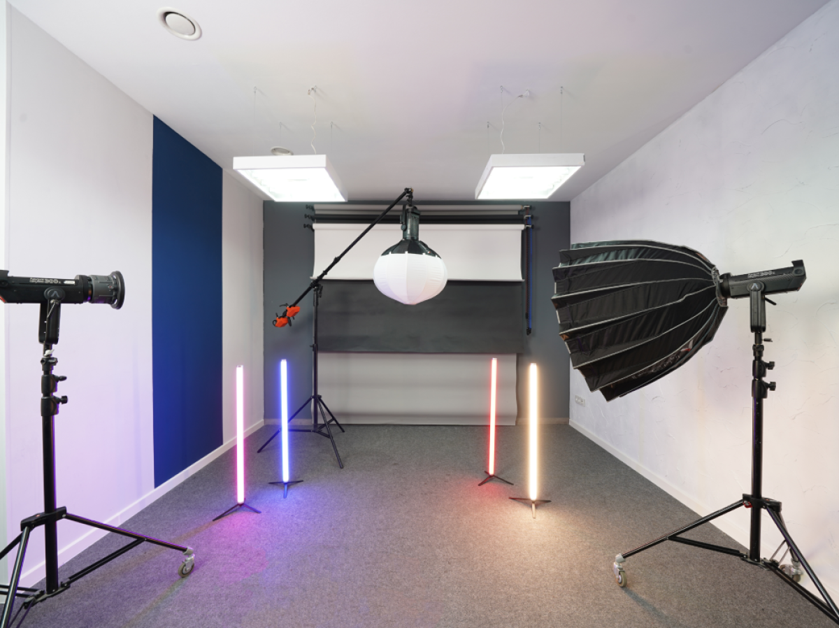 В студии доступны классические бумажные фотофоны (белый, черный, зеленый) для портретной, предметной