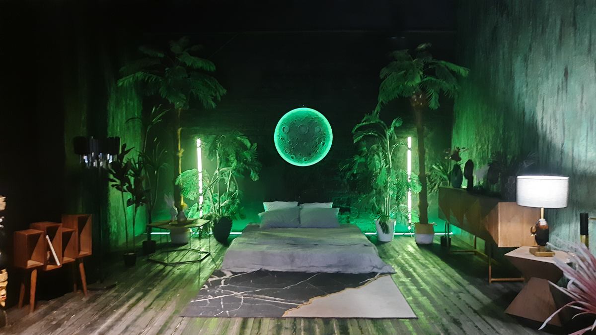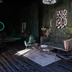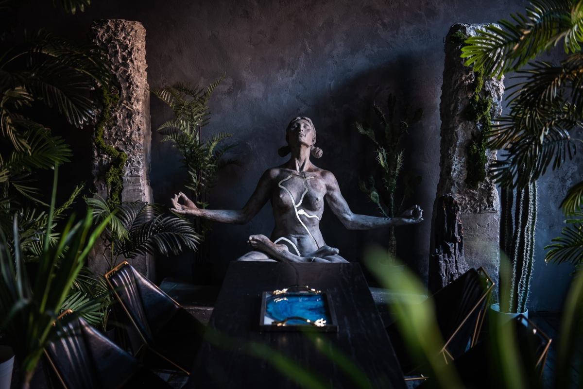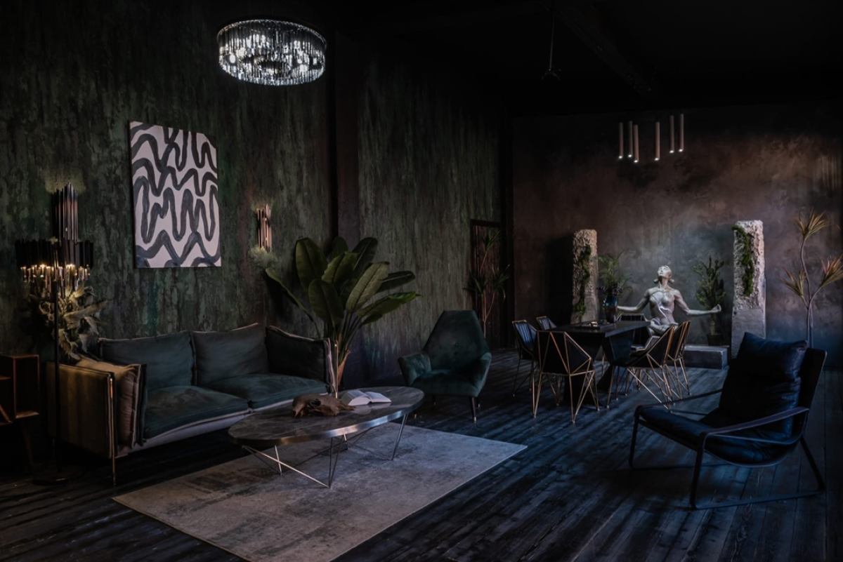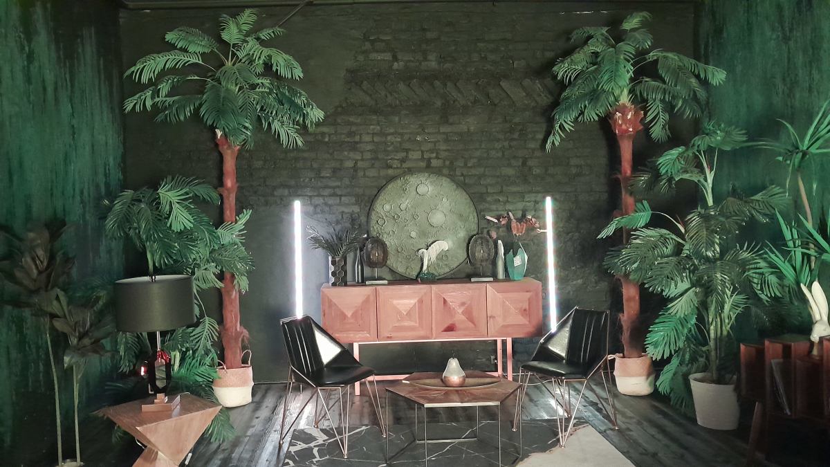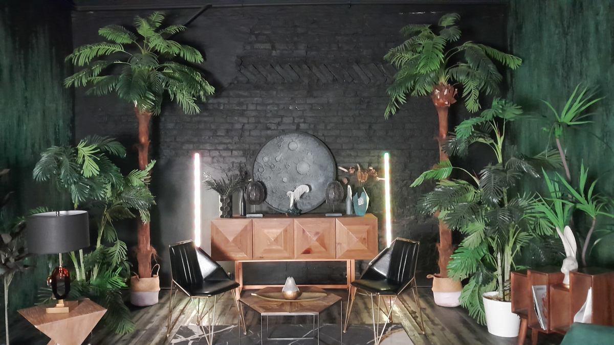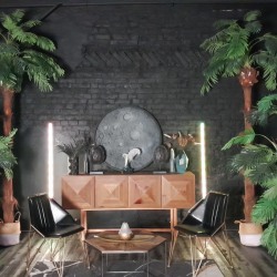 Шикарный тёмный зал в индийском стиле. 75 м.кв. Потолки 4 метра. Шторы блэкаут. Действующий биокамин. Кровать, зона для подкастов. Вся мебель в зале мобильна. Можно создать локацию по своему запросу. Много растений пальмы, банановое дерево папаротники, кактусы и др. Уникальная статуя. В стоимость аренды входит 1 час гримёрки и два любых источника света импульсные, постоянные или RGB Amaran.