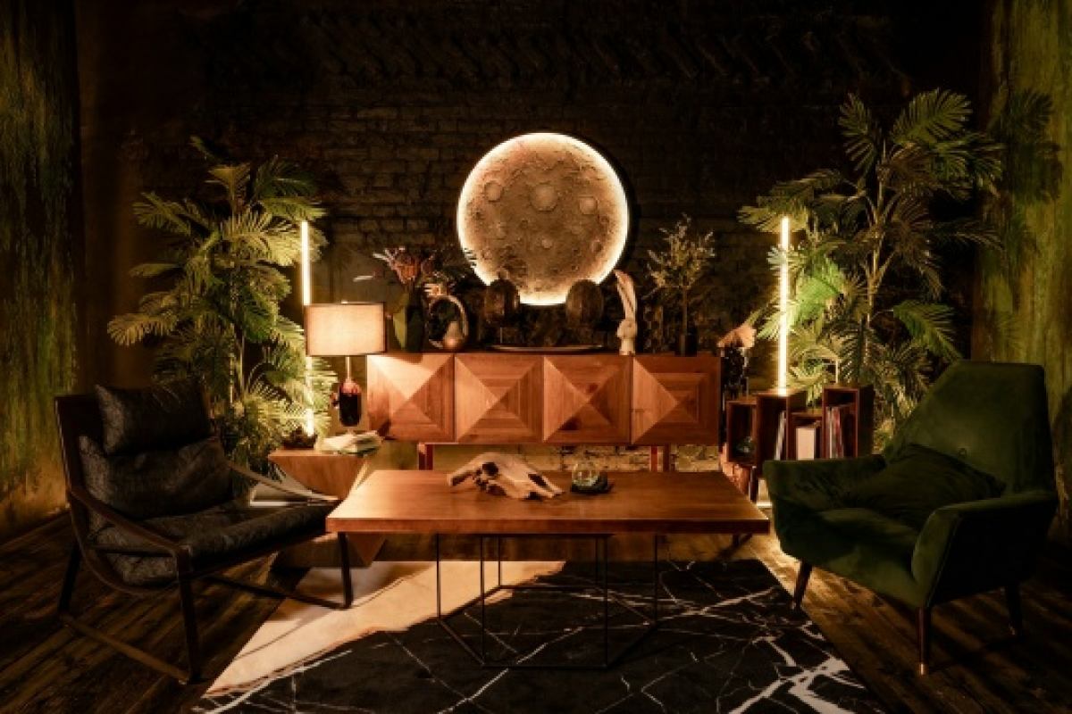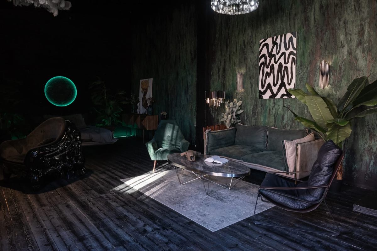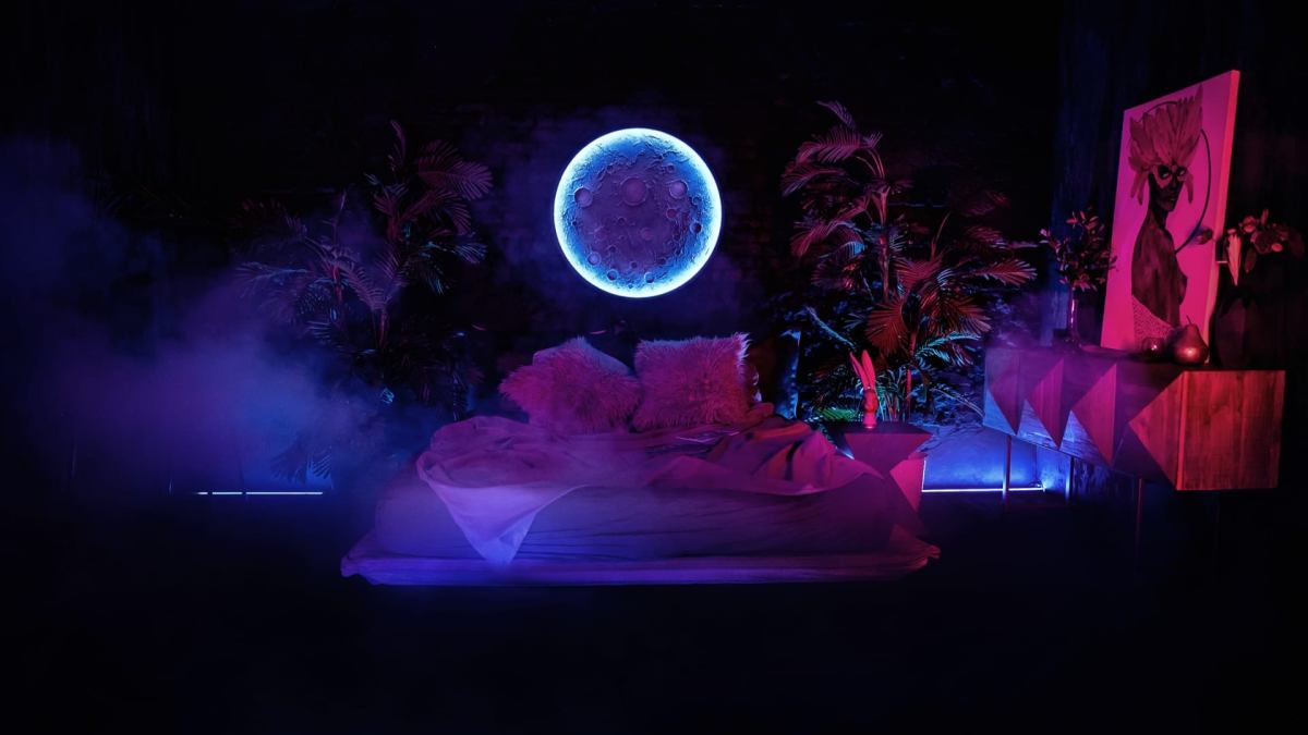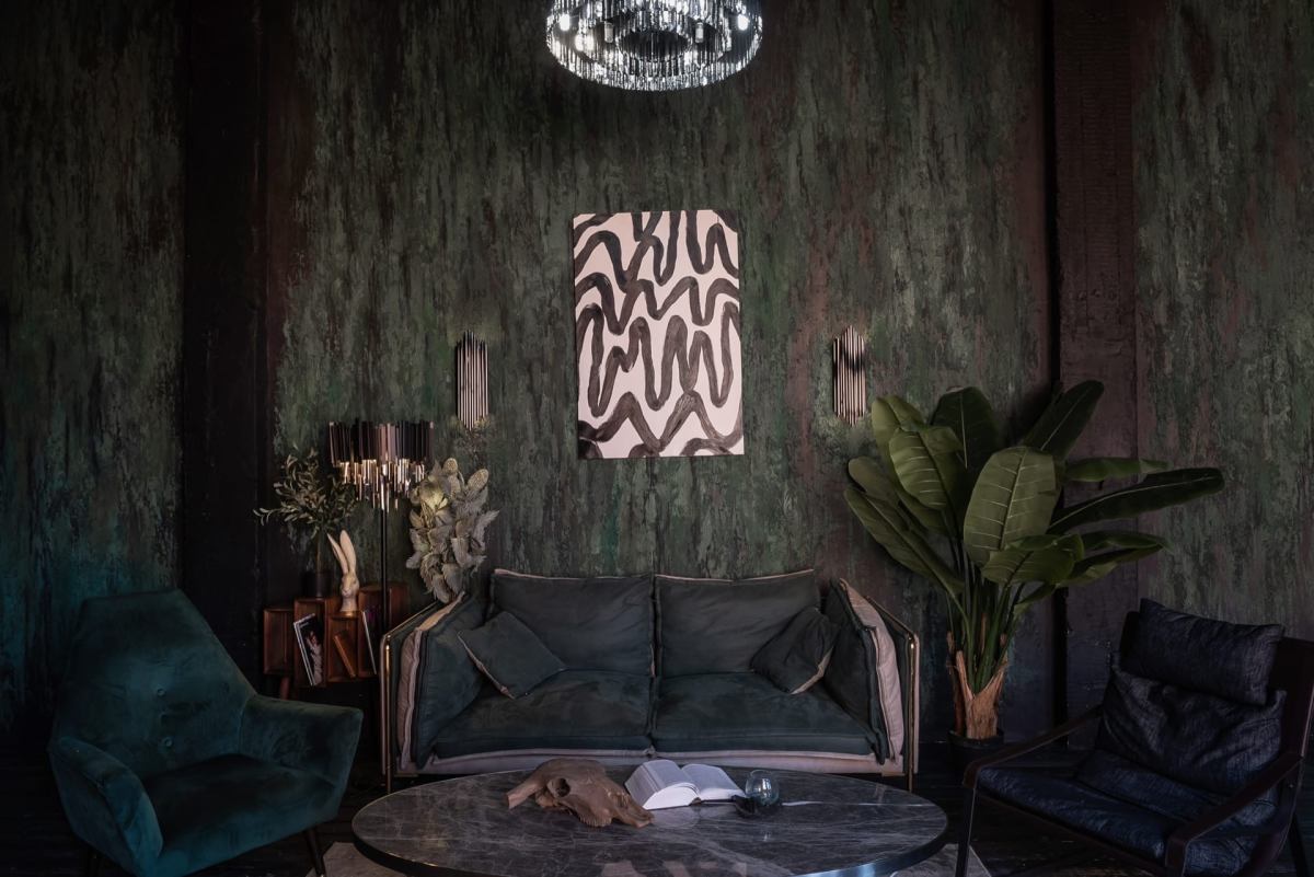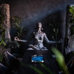 Шикарный тёмный зал в индийском стиле. 75 м.кв. Потолки 4 метра. Шторы блэкаут. Действующий биокамин. Кровать, зона для подкастов. Вся мебель в зале мобильна. Можно создать локацию по своему запросу. Много растений пальмы, банановое дерево папаротники, кактусы и др. Уникальная статуя. В стоимость аренды входит 1 час гримёрки и два любых источника света импульсные, постоянные или RGB Amaran.