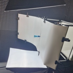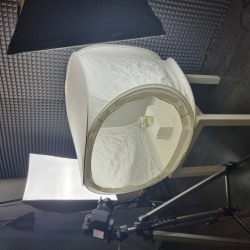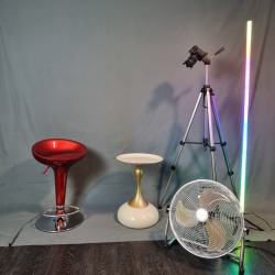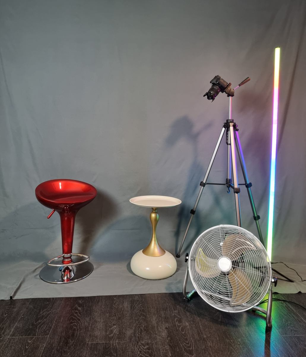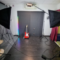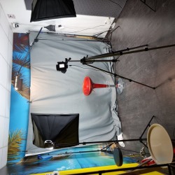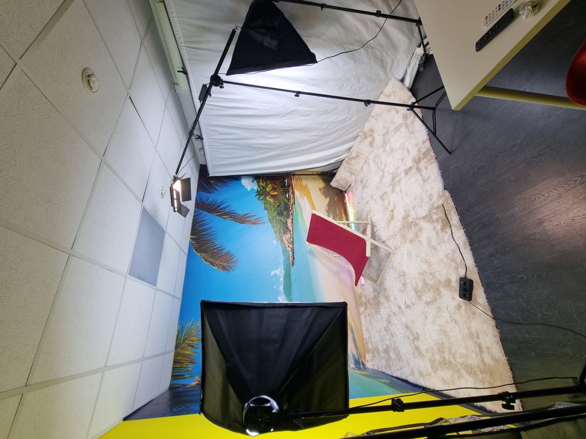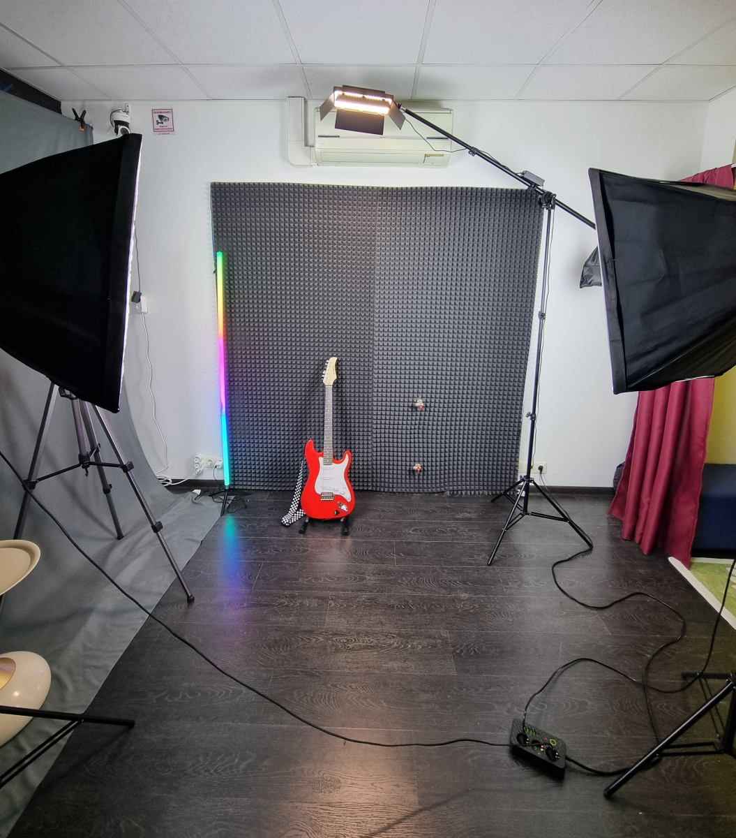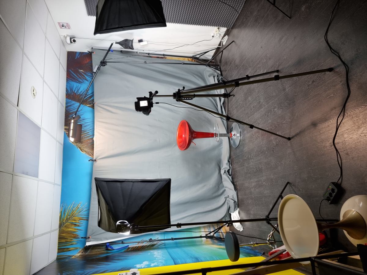 В студии есть 3 светильника, 5 тканевых фонов 3х3 м, пляжный фон 3х2.5 м, поролоновый фон звукозаписи, штатив, отражатели, разные стулья, красивый столик, фотобокс и стол для предметной съемки, зеркало в полный рост, подсветка RGB, электрогитара, пляжный шизлонг сидячий.