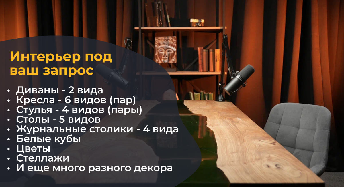Стильная стрим-студия: Идеально подходит для проведения прямых эфиров и вебинаров.