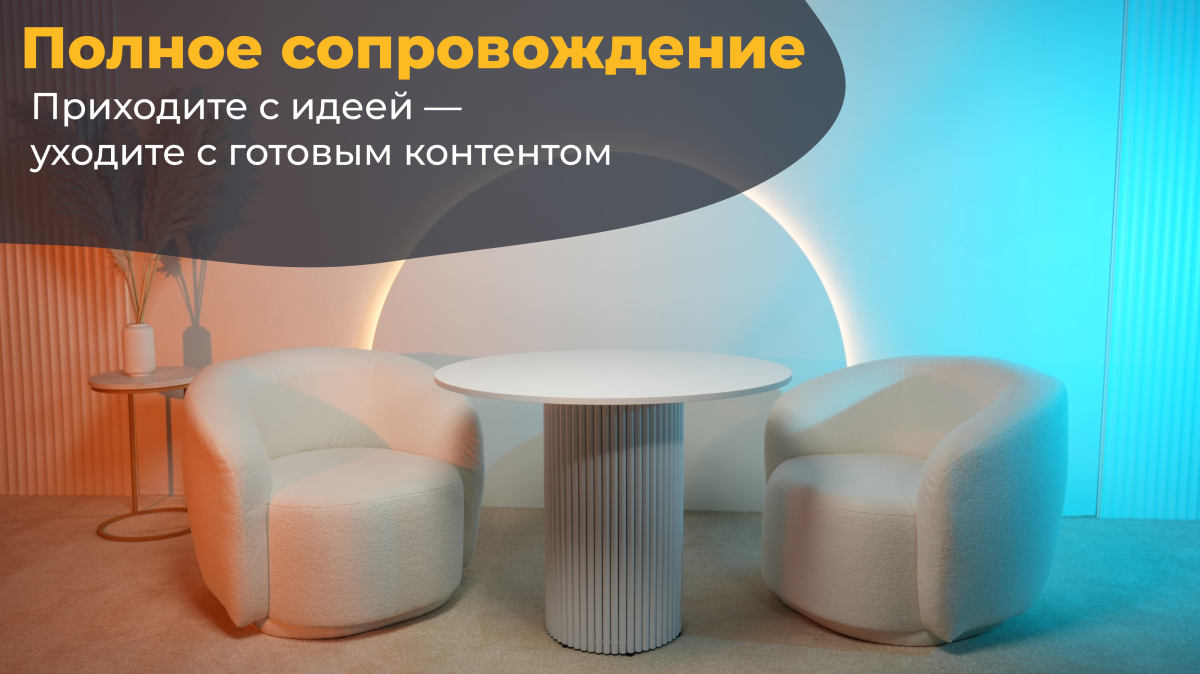 Локация «Белая»: Чистое, светлое пространство с фактурной стеной. Главный акцент — мягкая подсветка в форме арки. Идеальная база для любого контента и студии для интервью. Вы сами выбираете цвет подсветки под свой запрос.