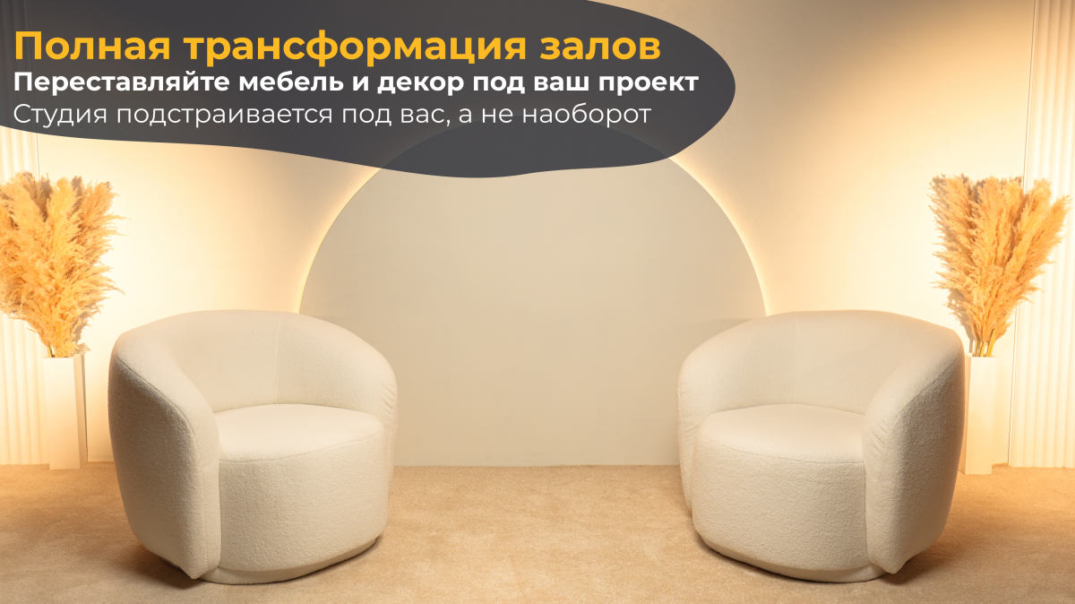 Зал «Позитив» — это не просто набор готовых фонов, а настоящий конструктор для создания идеального кадра. Всю мебель и декор можно легко переставить, чтобы