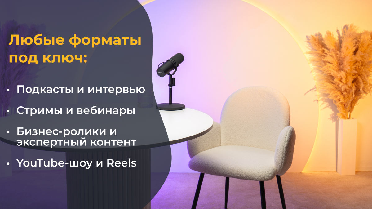 Гибкие форматы: От экспертных рилс до масштабных видеоинтервью или шоу со зрителями. Если вам нужна студия для подкаста в Москве с возможностью быстрой смены декораций — «Smile Studio» станет вашим лучшим выбором.
