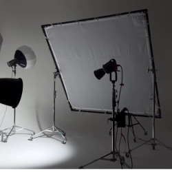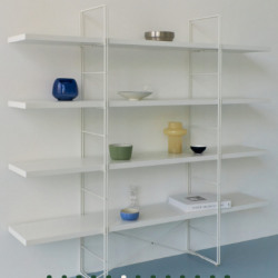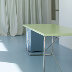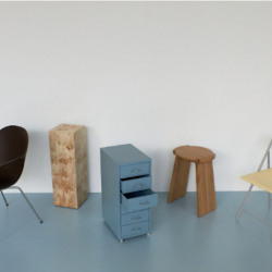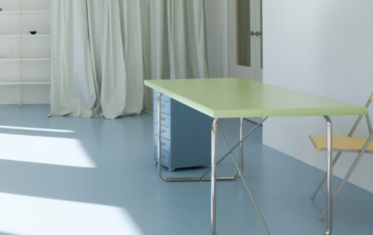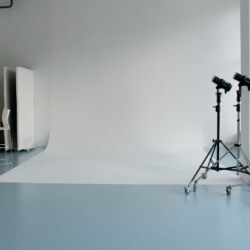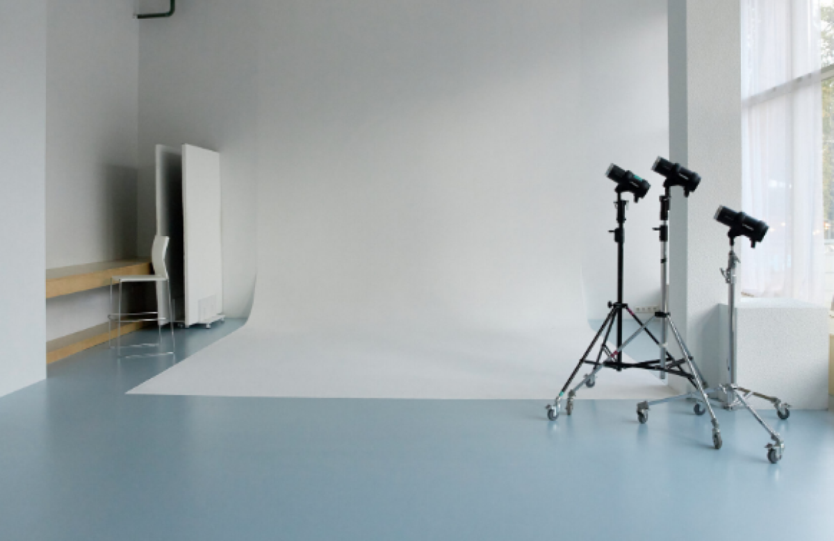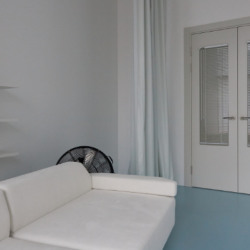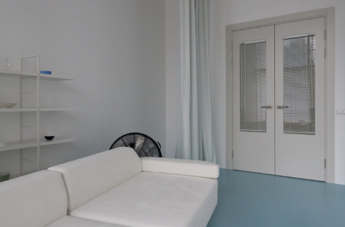 Зал с голубым полом и функциональным наполнением: циклорама 4 х 4 м, скамья из березовой фанеры во всю длину панорамного окна, фактурная белая колонна, оригинальные винтажные стулья, белый стеллаж Enetri, письменный стол и дверь, сделанные по нашим эскизам, а так же белоснежный диван Шатташ от компании Yaratam design.
