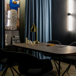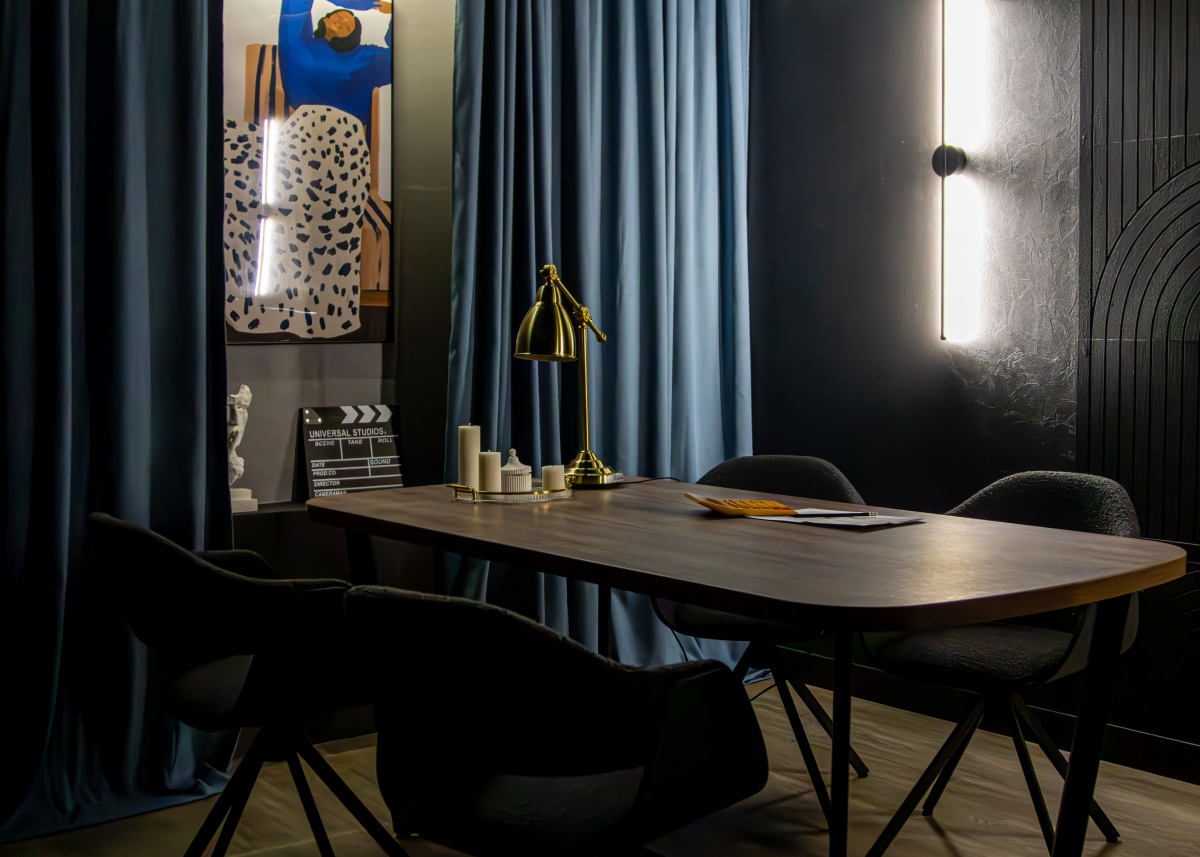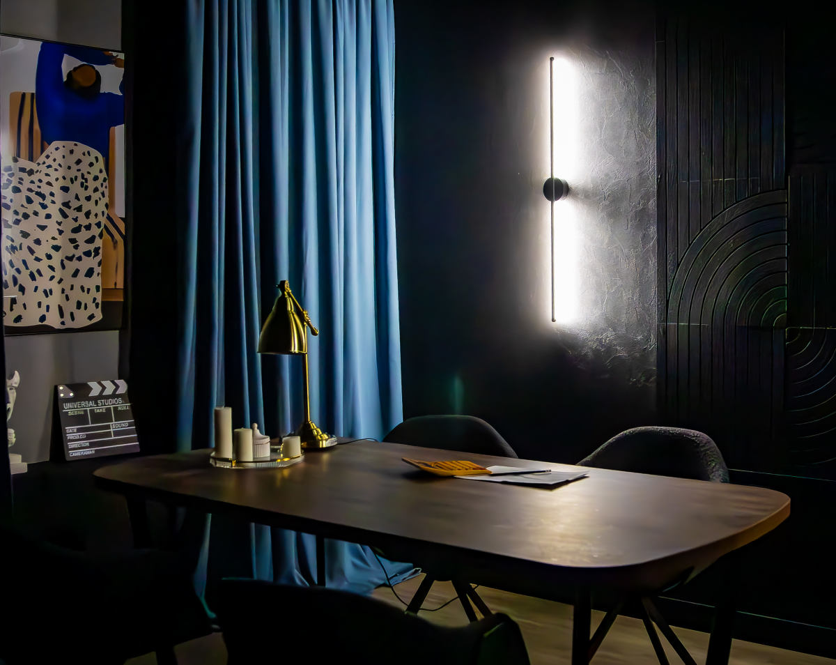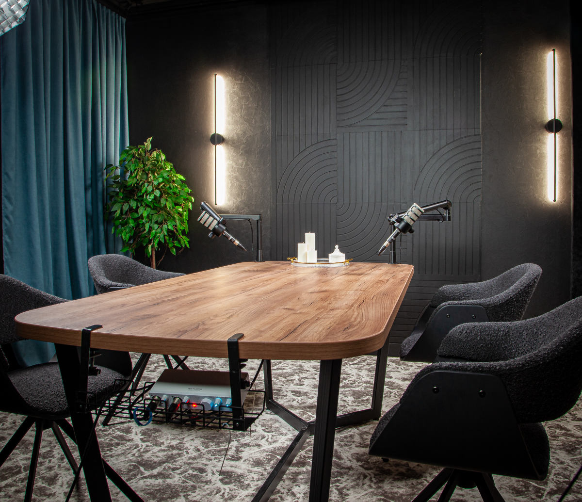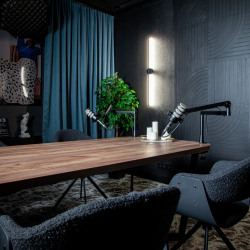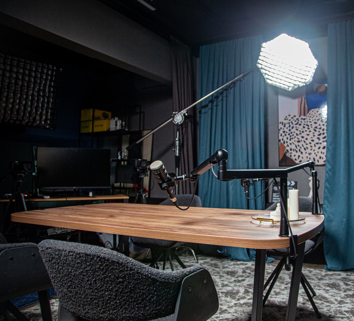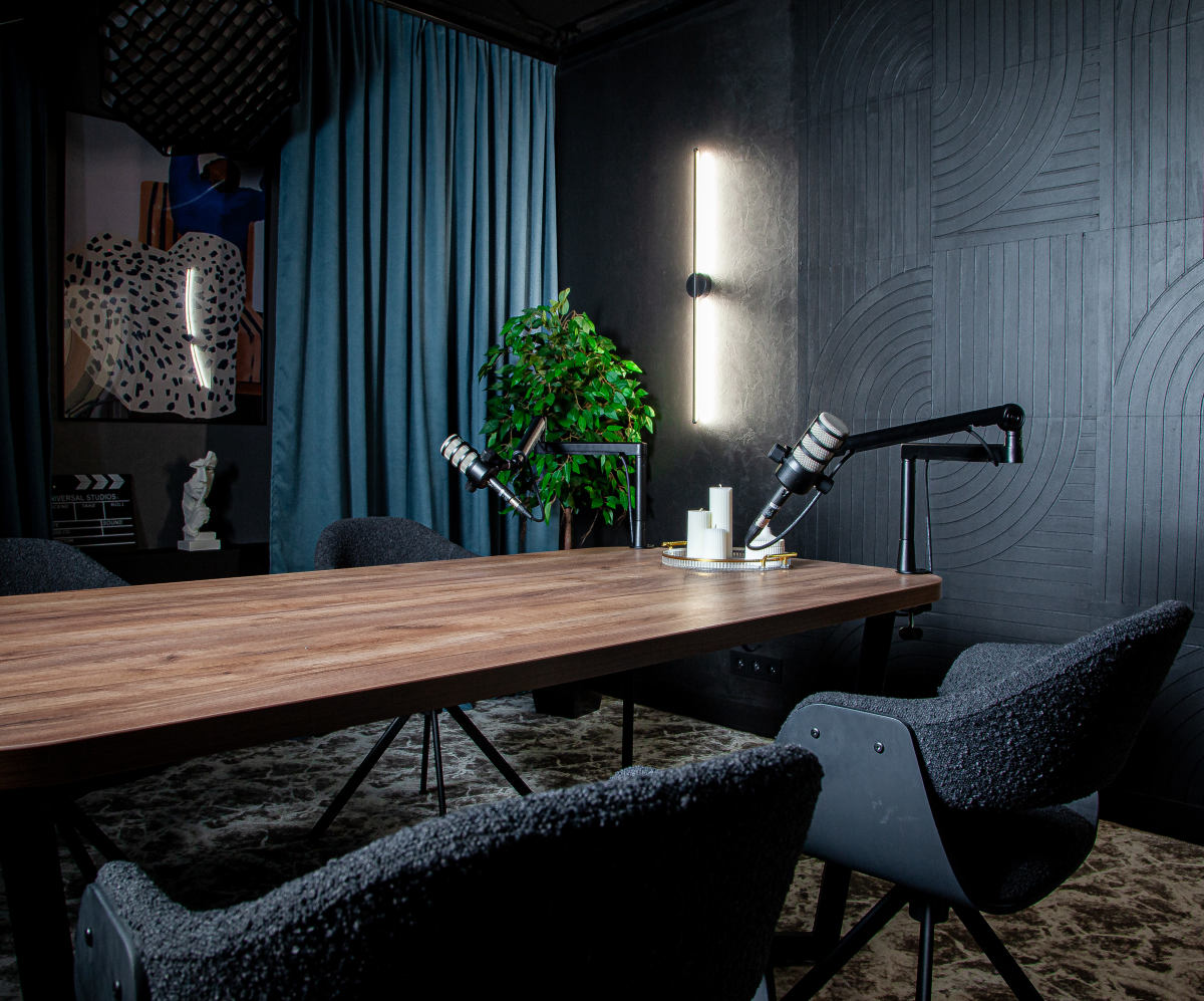 Функциональное пространство с выразительным современным характером, созданное для съёмок и записи контента на профессиональном уровне. Интерьер студии сочетает глубокие тёмные оттенки, графичные линии и продуманное световое оформление, формируя атмосферу концентрации и визуальной чистоты.