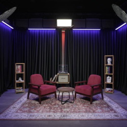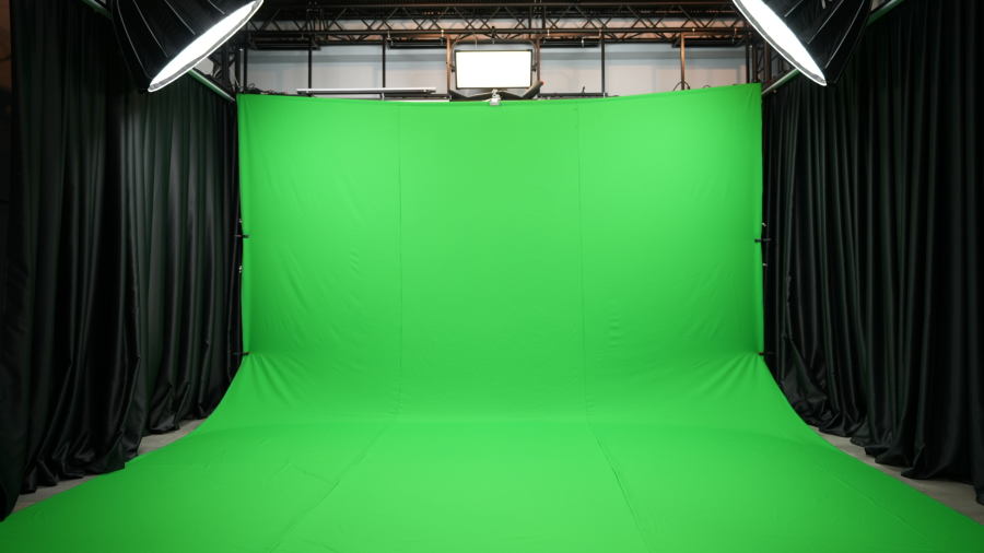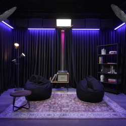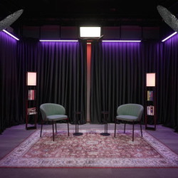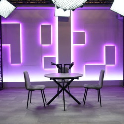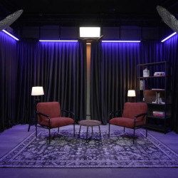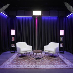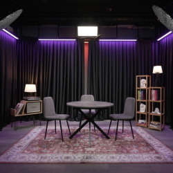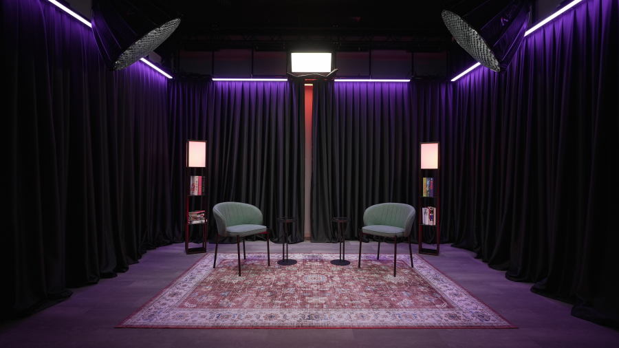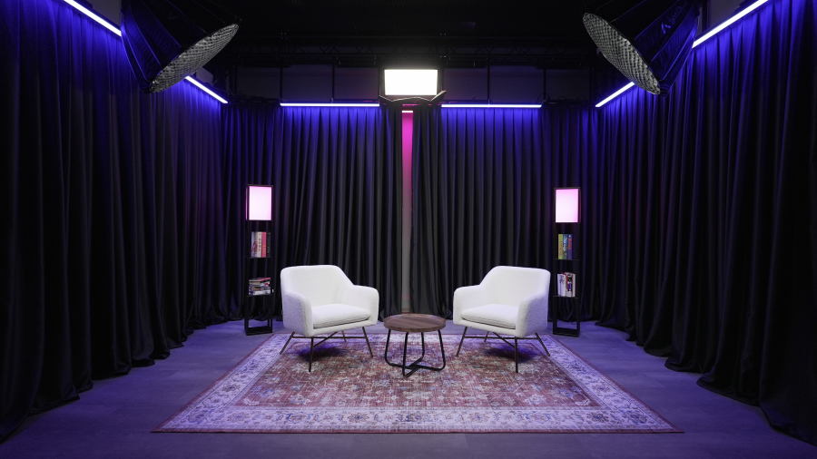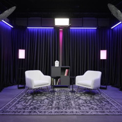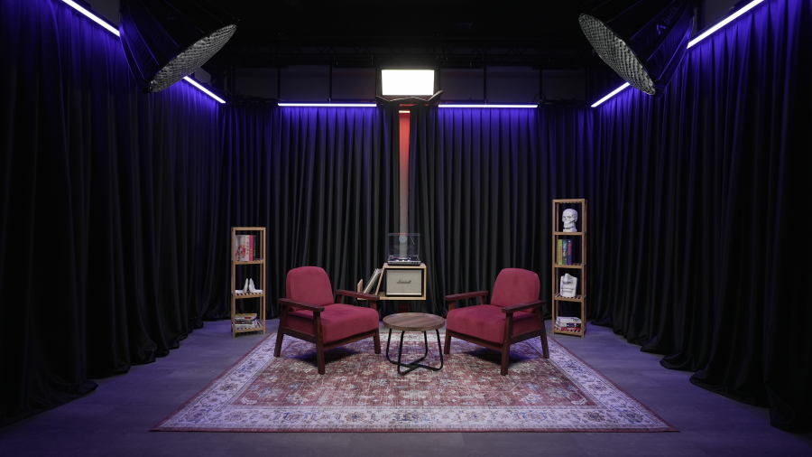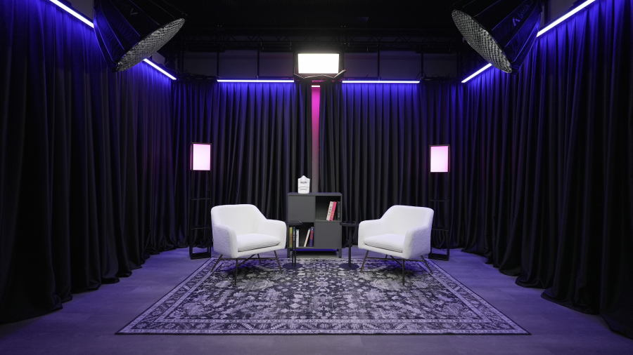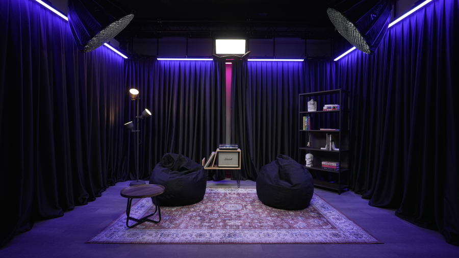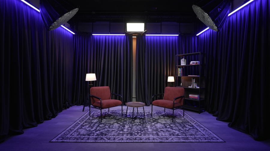 Пространство для подкастов и медиа проектов. Сет профессионального светового оборудования для создания идеальной картинки. Современный мультиформатный зал: элегантный черный текстильный фон,