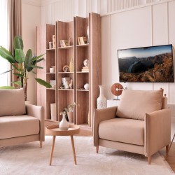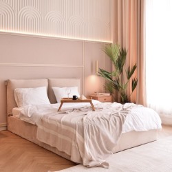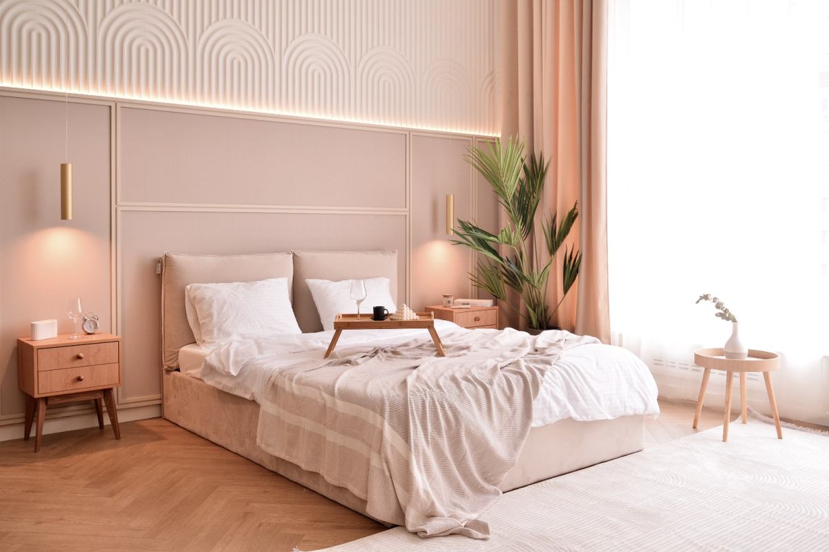 Уютный светлый интерьер с спальной зоной, гардеробной и гостиной.