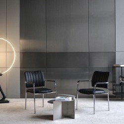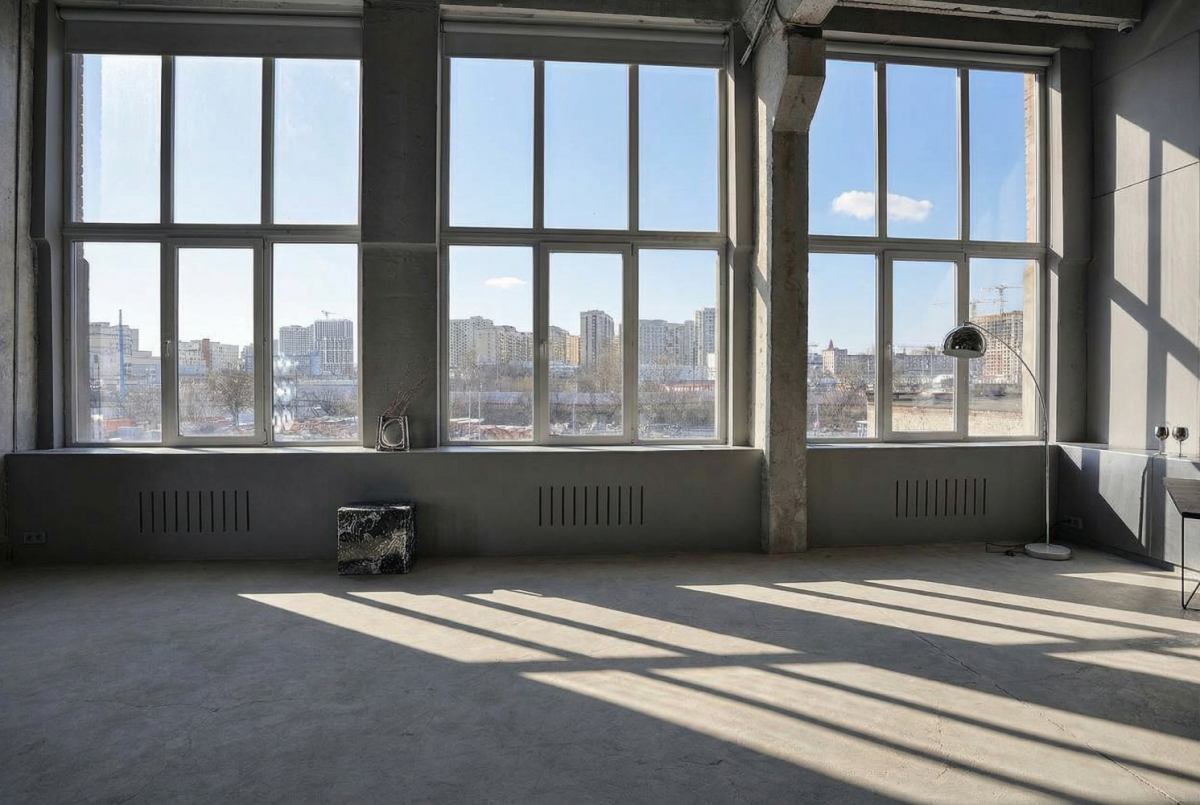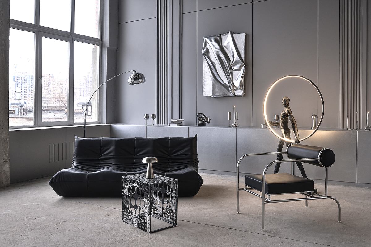 Бетон, металл и стильная минималистичная мебель. В студии есть мобильная стена со встроенными светильниками.