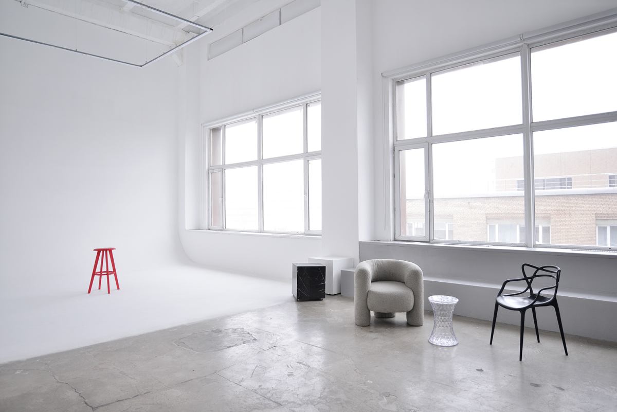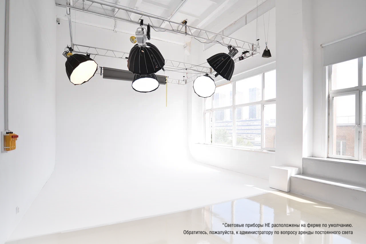 Светлый зал с циклорамой и большими окнами, отлично подходит для самых разных идей.