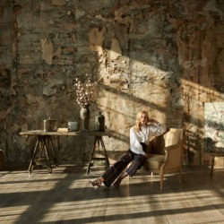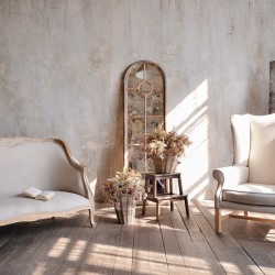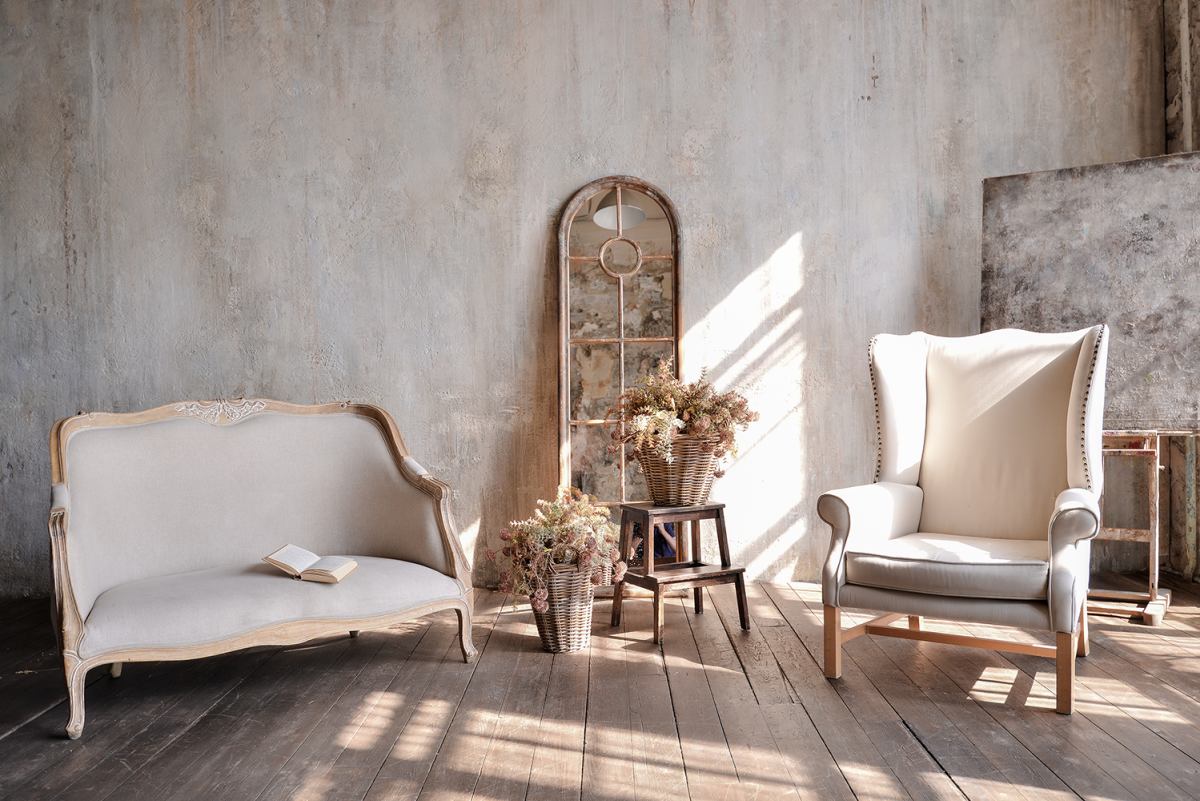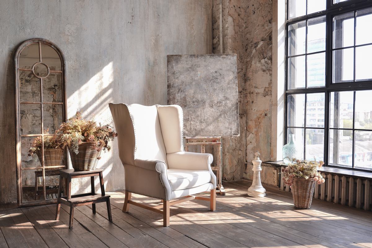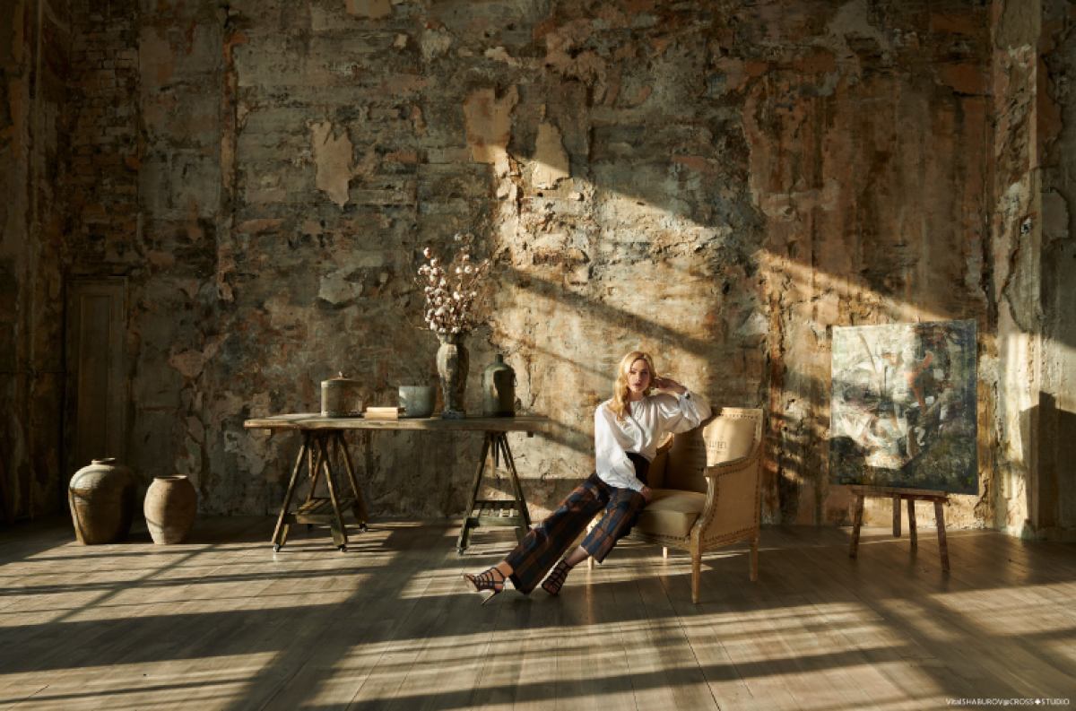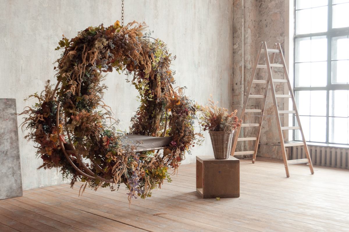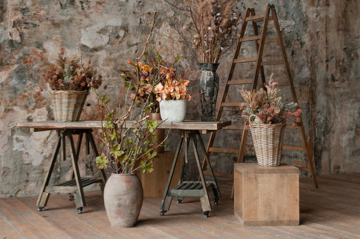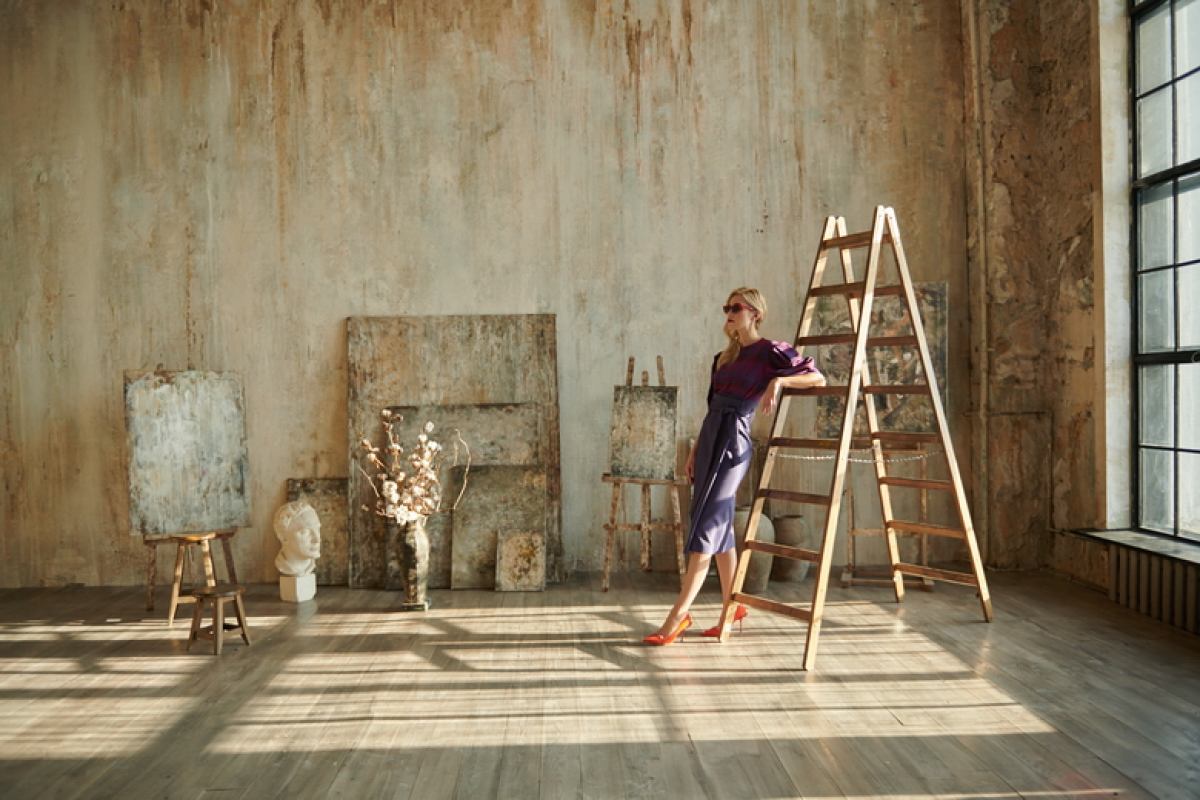 Зал в стиле мастерской художника. Невероятные фактурные стены, холсты, скульптуры, тканевый фон.