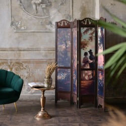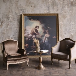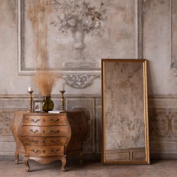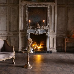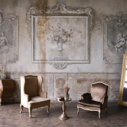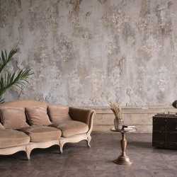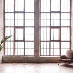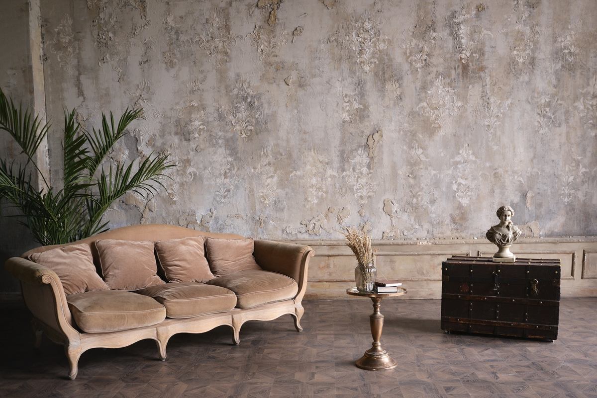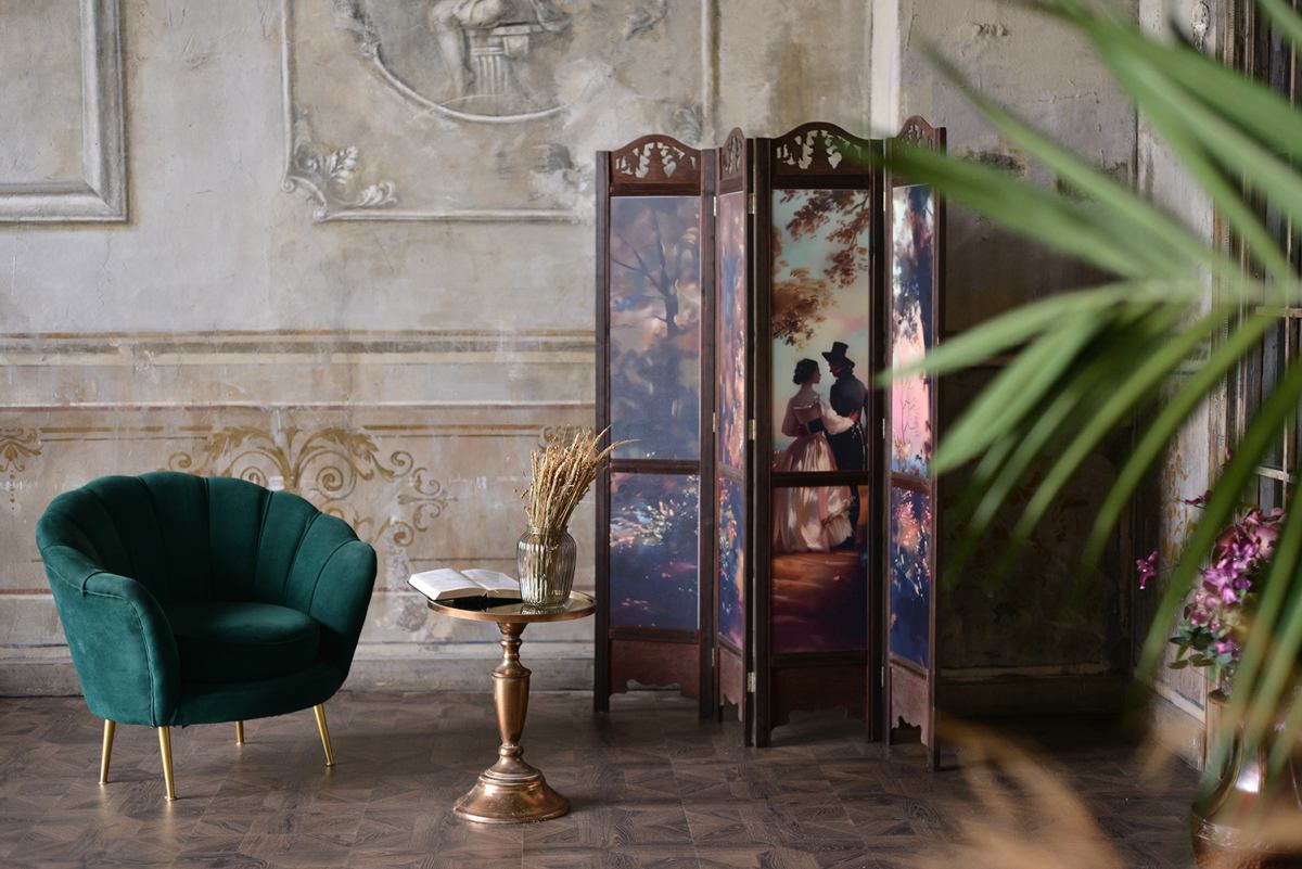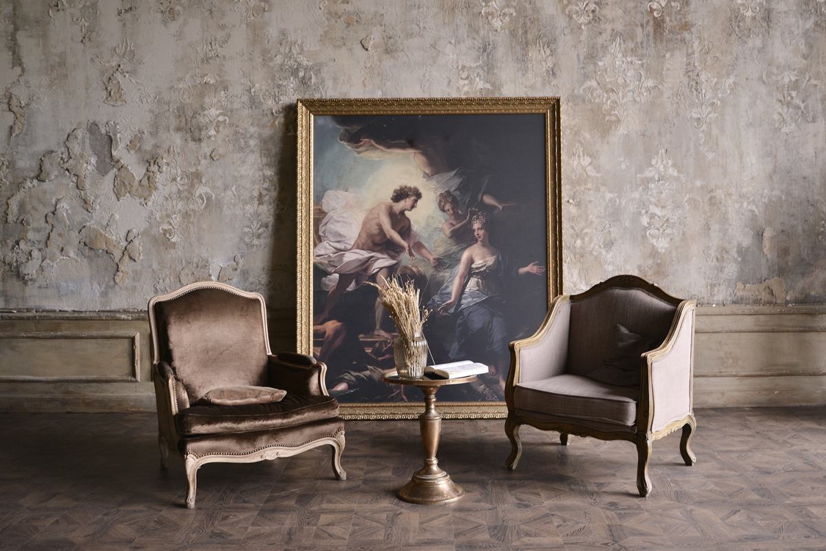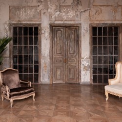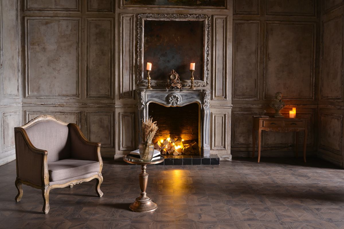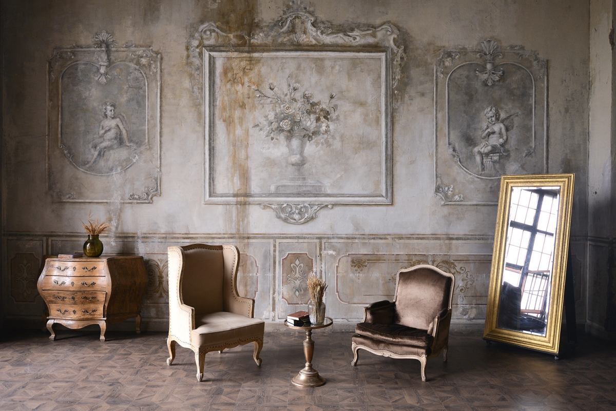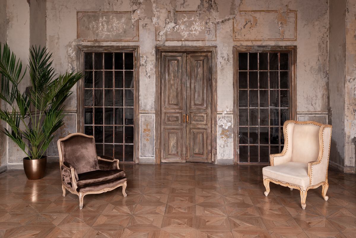 Классический темный интерьер с огромными окнами, лепниной и фактурными стенами.