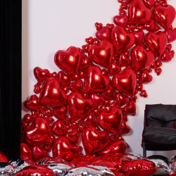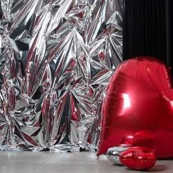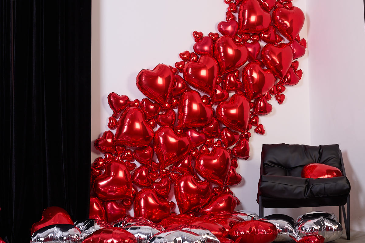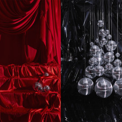 Просторный зал с дизайнерской двухметровой пирамидой из дискошаров, локация из красного атласа, множество фактурных стен.