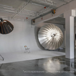 Огромный зал с большой белой циклорамой, моторизированной фермой и нейтральными текстурами Зал расположен на углу здания и поэтому освещается сразу с двух сторон естественным светом, что создает уникальный световой объем, так же предусмотрены шторы блекаут и за залом закреплен самый большой параболический зонт broncolor para 330