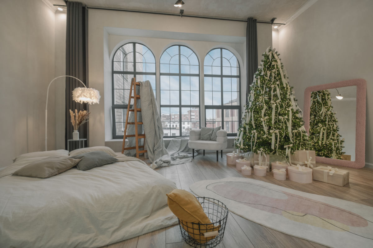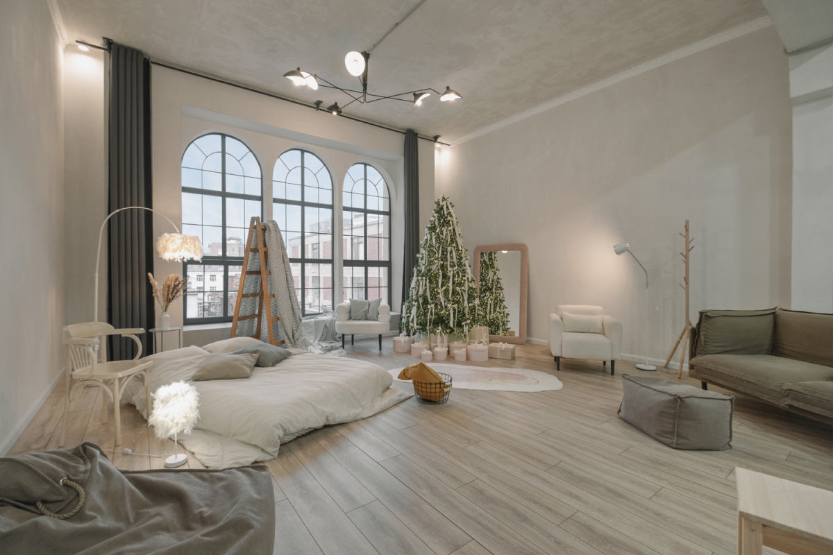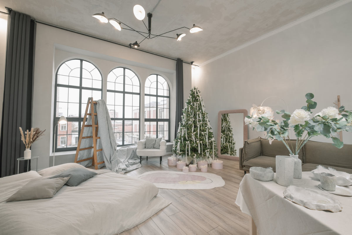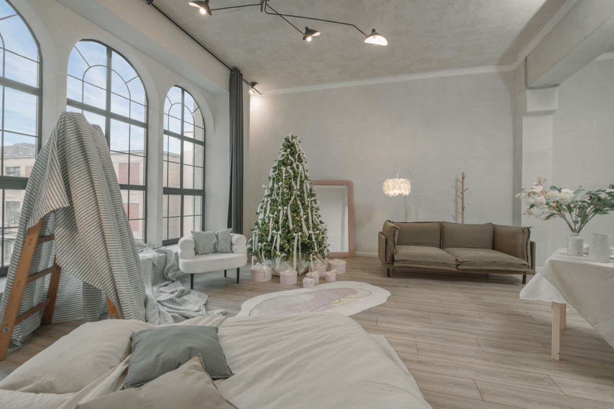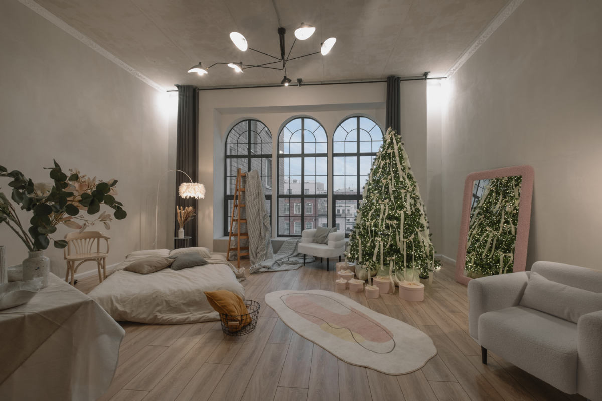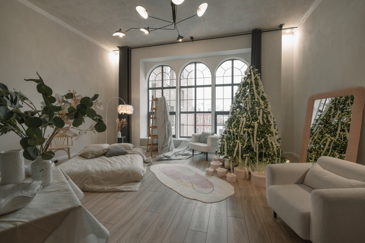 Зал с уютным домашним новогодним интерьером и большим количеством мебели