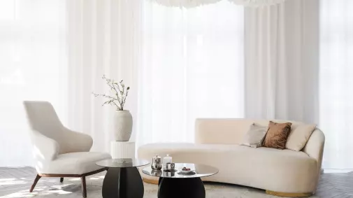 Светлый зал с акцентом на минимализм и современные тренды. Зеркала различных форм, драпированный диван на колесиках для удобства перемещения по залу.