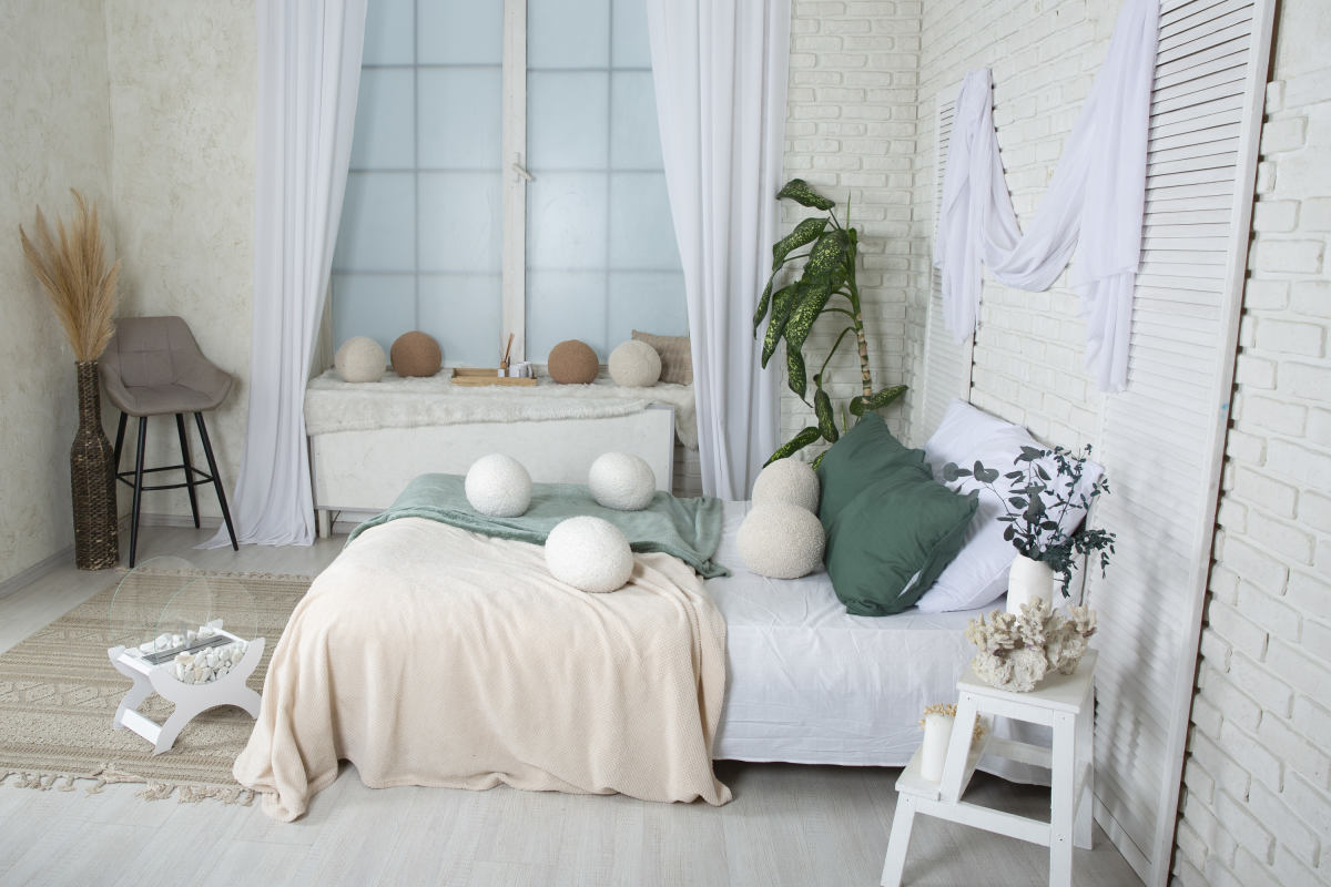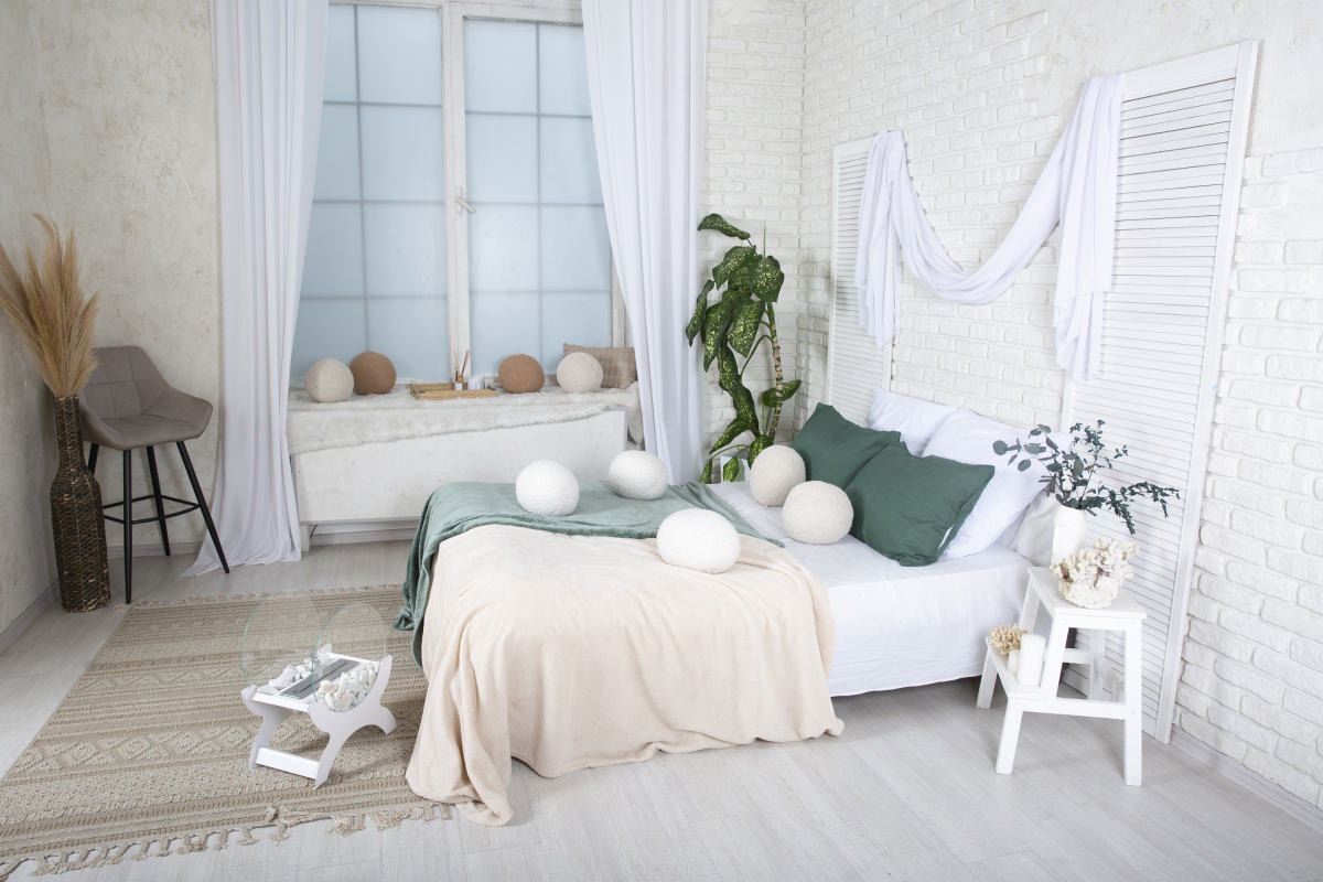 Большая Белая зона с кирпичной стеной, большим окном 3х2, кровать и детский уголок