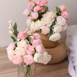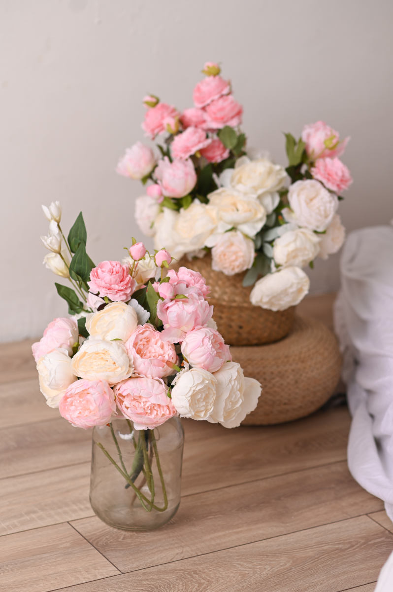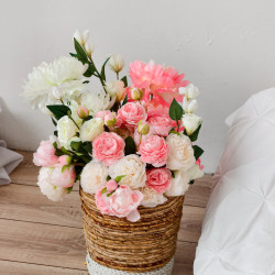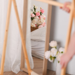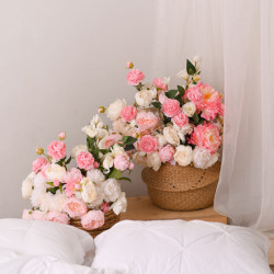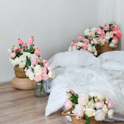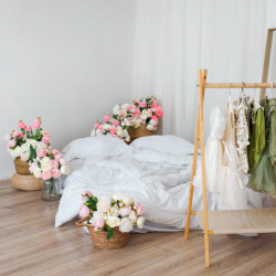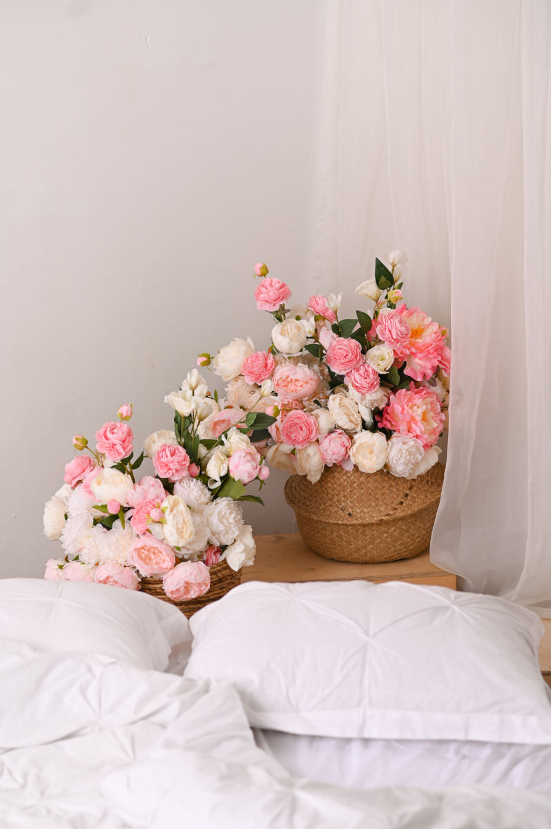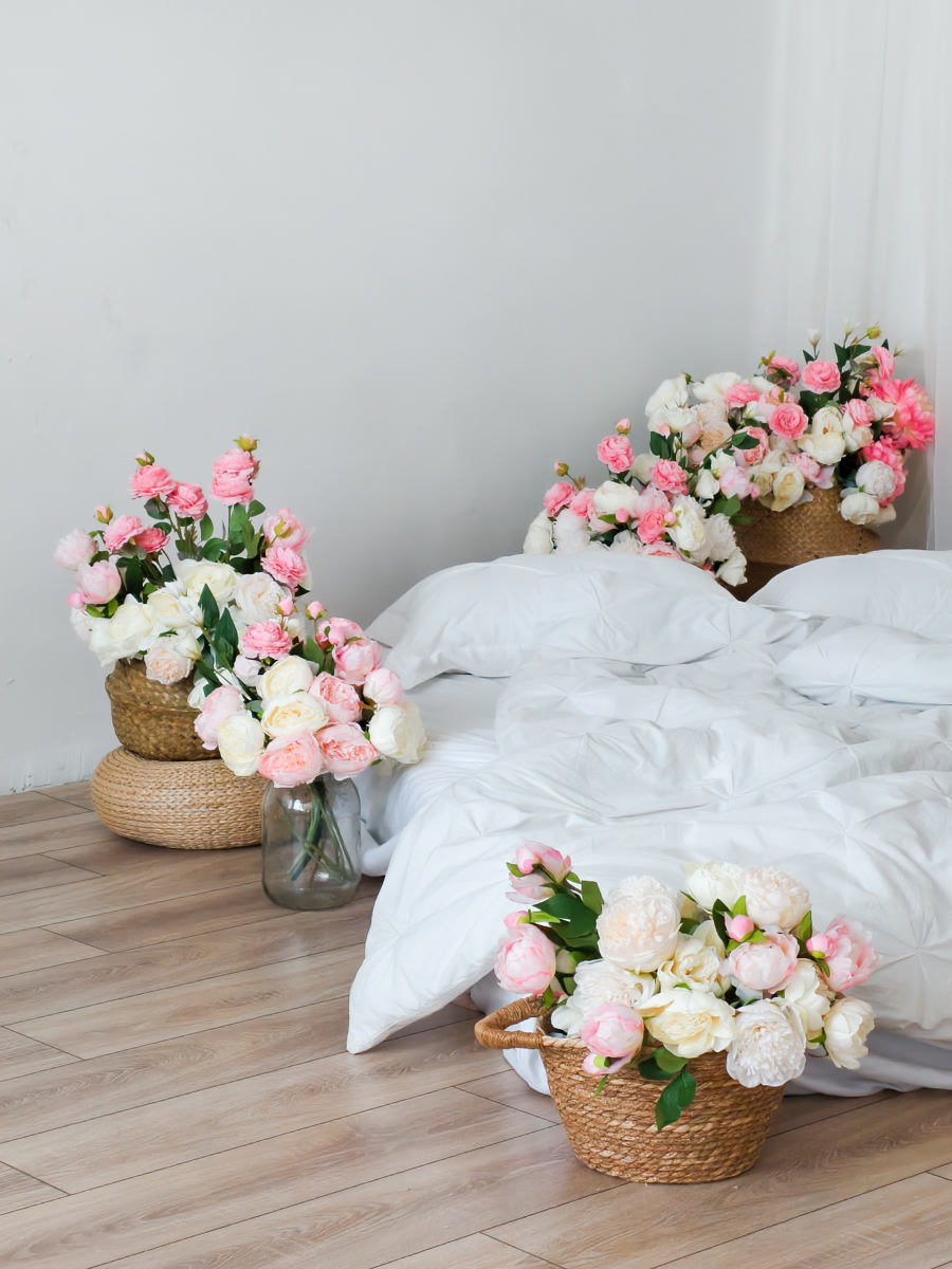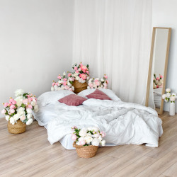 В зале располагается трендовая зона с матрасом и цветочными композициями.