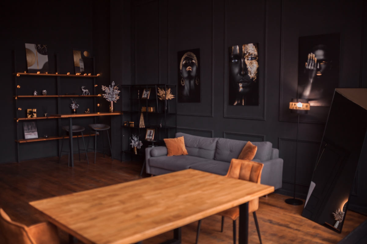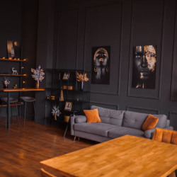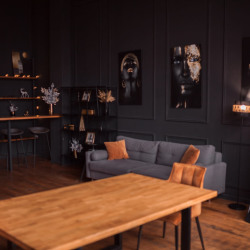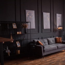 Из мебели: 2 дивана в серых тонах (один с банкеткой), стол и 2 кресла (стулья можно взять бесплатно), зона библиотеки с книгами и аксессуарами + олегченная барная стойка (можно использовать какписьменный стол), 2 арных стула, деревянный подиум возле окна (при проведении мероприятий можно положить мягкие подушки как дополнительные посадочные места), черные кофейный стол, тумба под телевизор с аксессуарами, ростовое зеркало, бльшие живые и искуственные растения, 2 торшера.