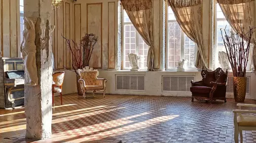 Светлый , прямоуголной формы зал. В зале одно большое панорамное окно в пол
