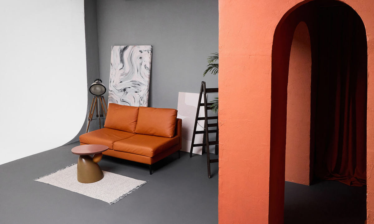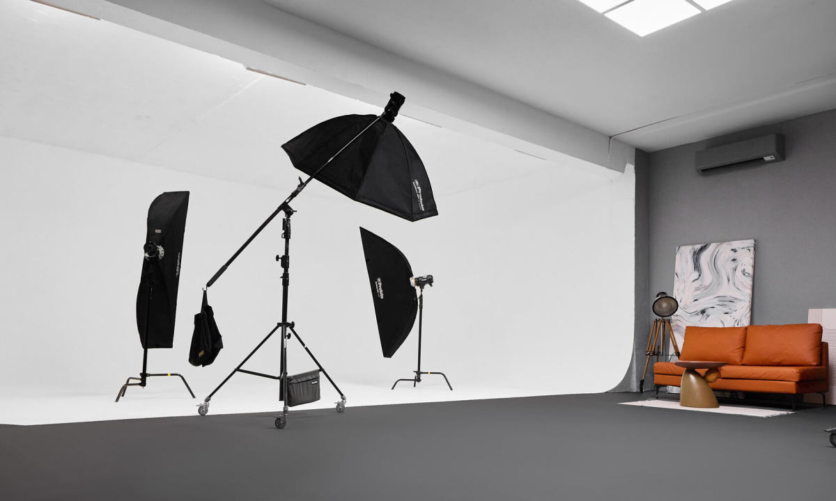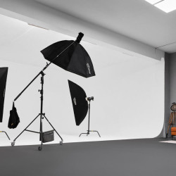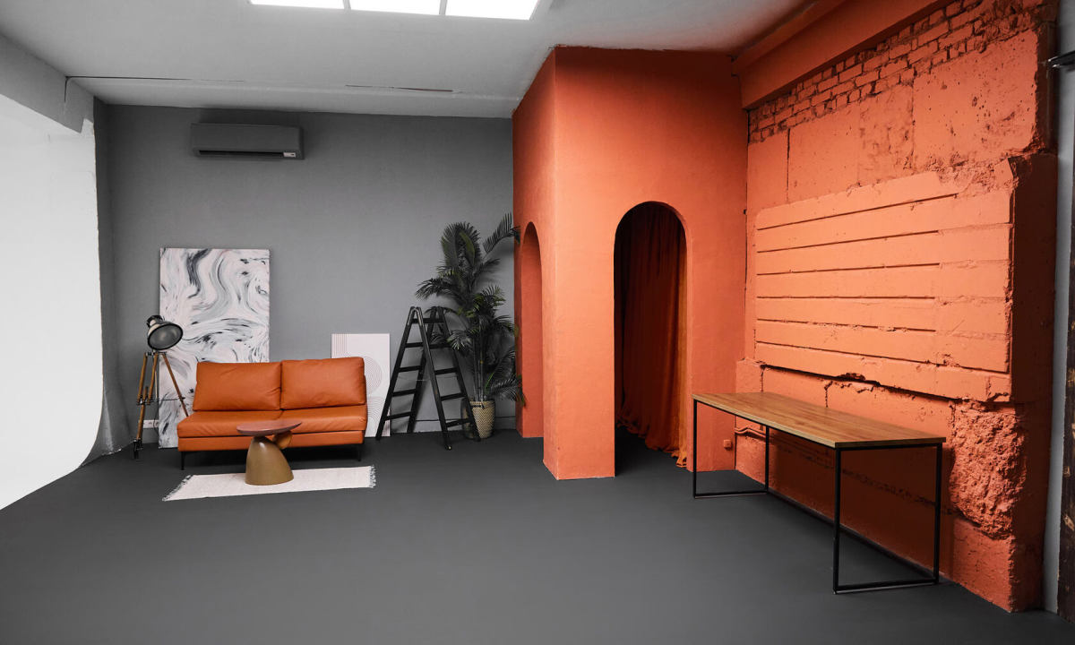 Наш самый большой зал 130м2 с угловой циклорамой 8 x 5,5м. Зал включает в себя дополнительное помещение 30м2, где можно готовиться к съёмке, а также отдыхать в перерыве. Также, в Orange Land присутствует стильная
