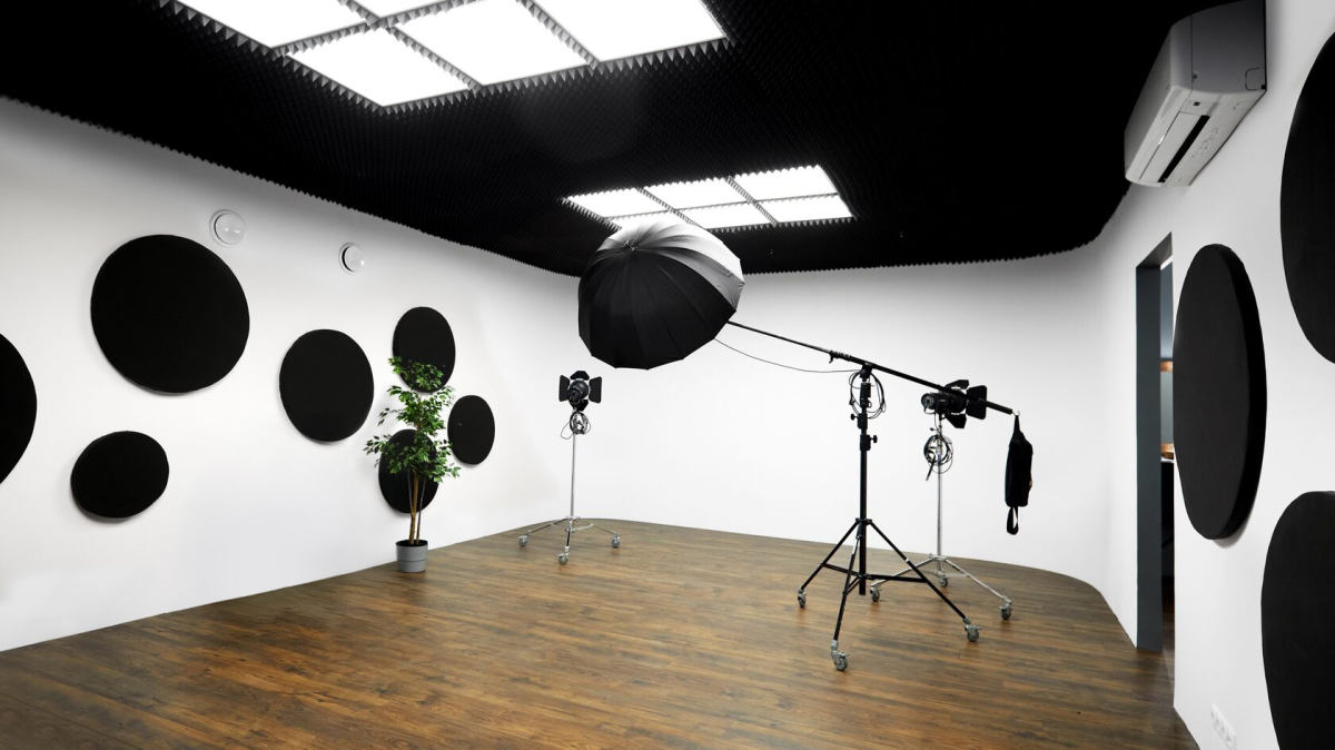 Зал с профессиональной звукоизоляцией. Отлично подходит для записи передач, блогов, интервью, актёрских визиток и много другого