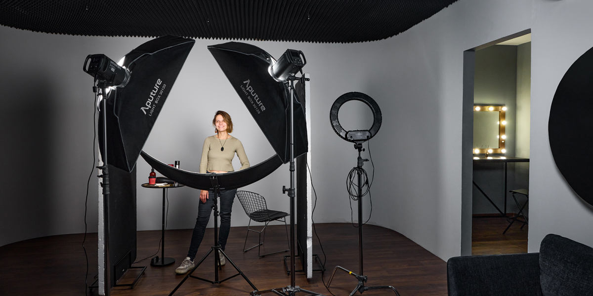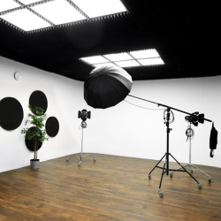 Белая стена без углов позволяет значительно расширить угол съемки, а три крепления на потолке осветить стену или добавить контурный свет на предмете съемки любым из источников постоянного света.
