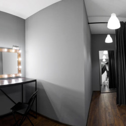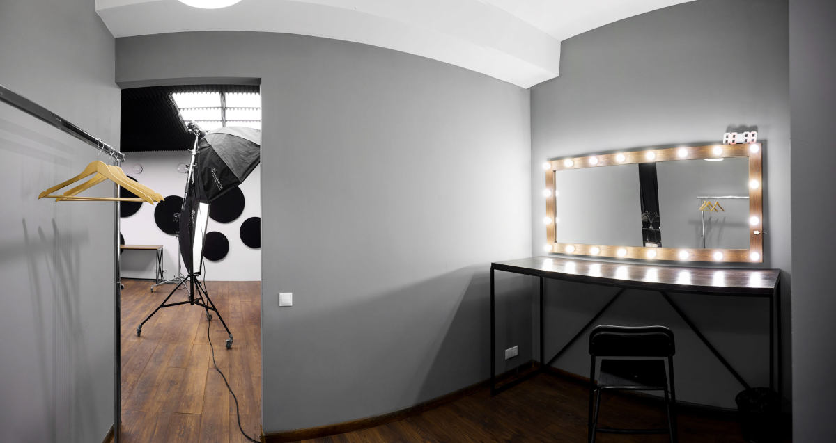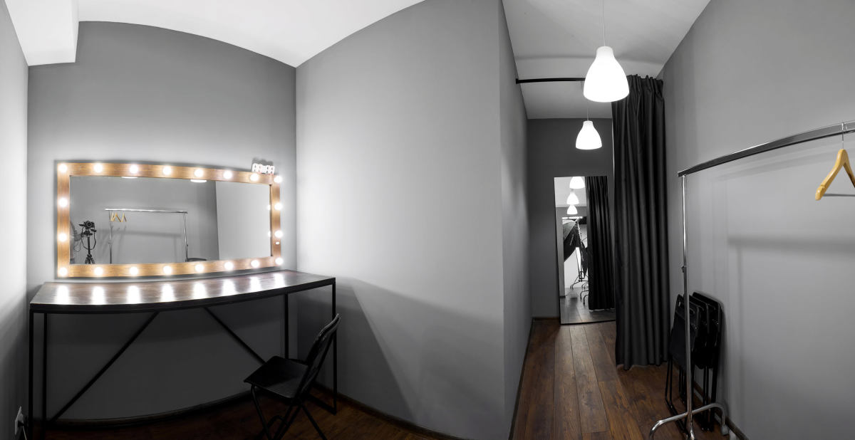 Гримерная и примерочная зоны отделены от зала, чтобы не мешать основному рабочему процессу.