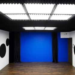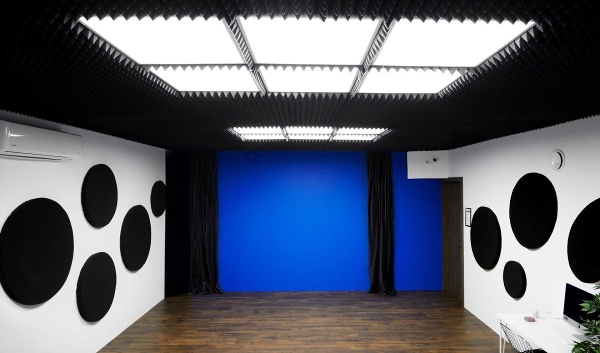 Потолок зала покрыт звукоизоляционным материалом, а в ближайшие недели зал будет дополнен настенными звукопоглощающими панелями для записи чистого и качественного звука.