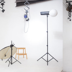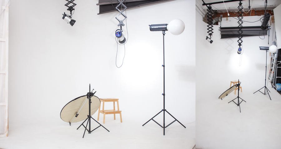 Моноблоки Hensel, световые насадки жесткого и мягкого света, разного размера софтбоксы, стрипбоксы, октабокс, портретные тарелка, рефлекторы, тубус. На окнах имеются горизонтальные жалюзи для затемнения и диффузоры. Окна студии выходят на солнечную сторону.