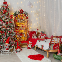 Новогодние декорации в светлом зале. В нашей студии царит атмосфера праздника! Две новогонодние фотозоны, множество детского реквизита. Детская спальня, подвесные качели кокон, качалка овечка, маленкие стульчики, люлька и много игрушек. Циклорама....
