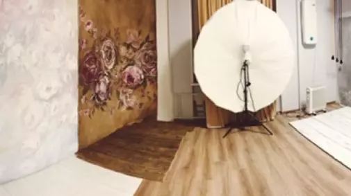 В зале находятся бумажные фоны (2,7 метра): черный, коричневый, серый. Подиум с темными досками. Панели со светлыми досками. Стойка с бинбегом для съемки новорождённых.