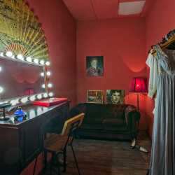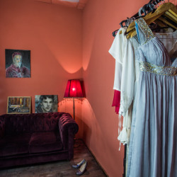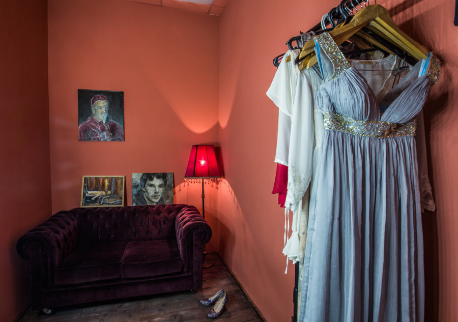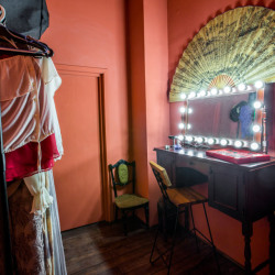 Наша гримерная выполнена в стиле театральной гримерной. На столике украшения, бинокль, на стенах театральные афиши, антикварная мебель помогут проникнуться духом настоящей театральной гримерной.