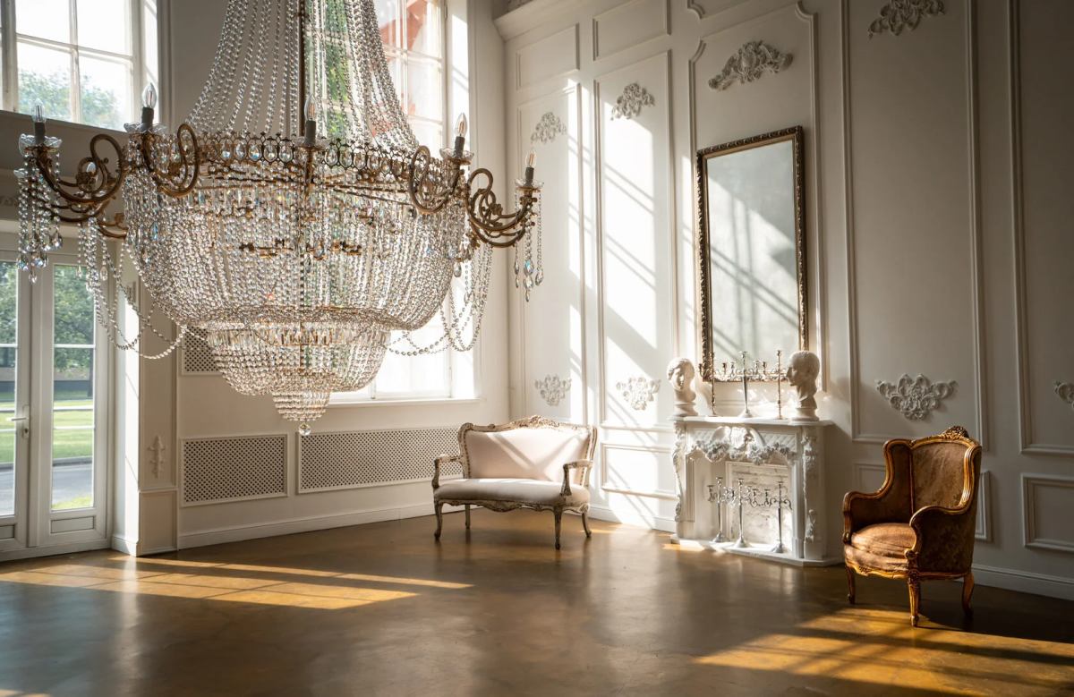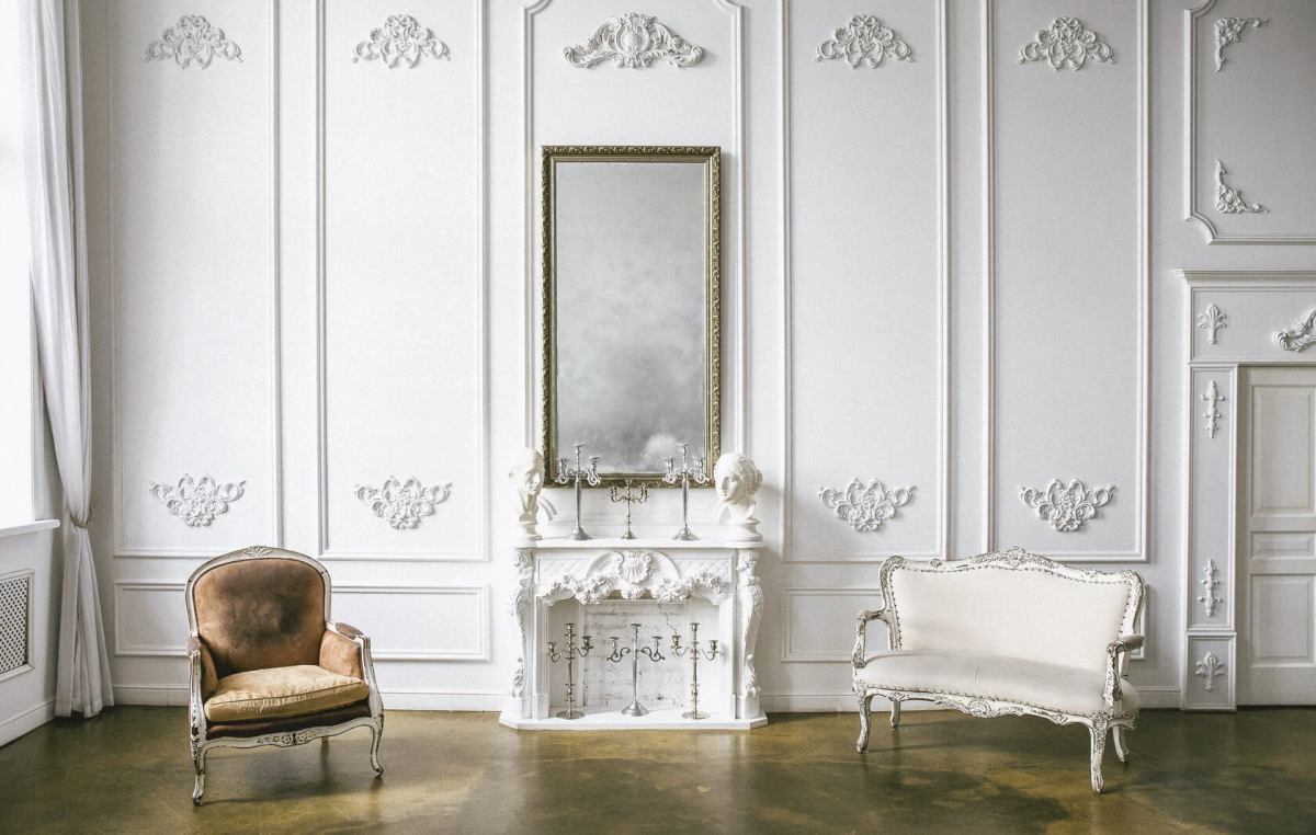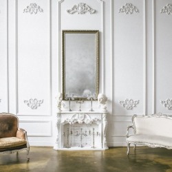 - дворцовый интерьер с камином, гипсовыми головами и канделябрами, состаренное зеркало;