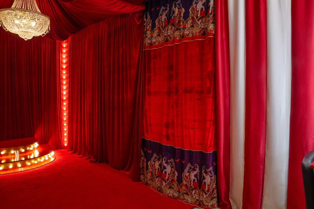 Красное бархатное пространство, с подиумом и роскошной люстрой, идеально для творческих проектов. 18m2.