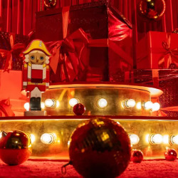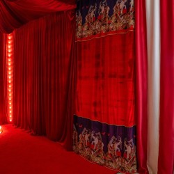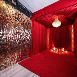Фон из золотых пайеток, красный гримерный стол, дополнительный реквизит: