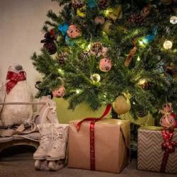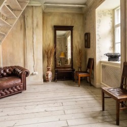На первом этаже располагается старинная усадьба с винтажной мебелью, зеркалом, торшерами картинами и лестницей.