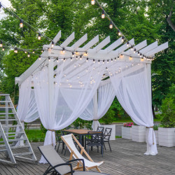 Деревянный настил, большая беседка (пергола) с белыми шторами, золотая клетка, стол с шестью стульями, два шезлонга, растения и лампочки!