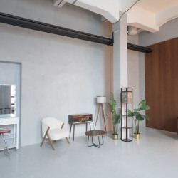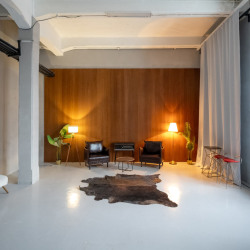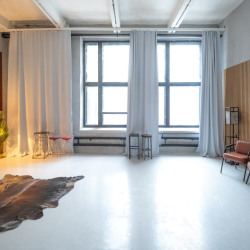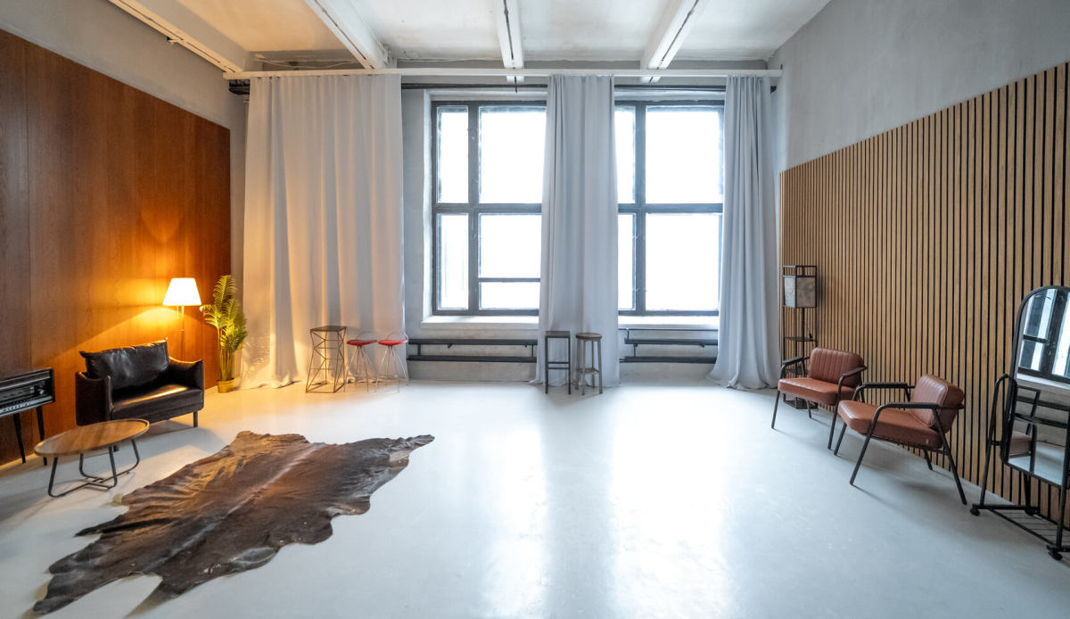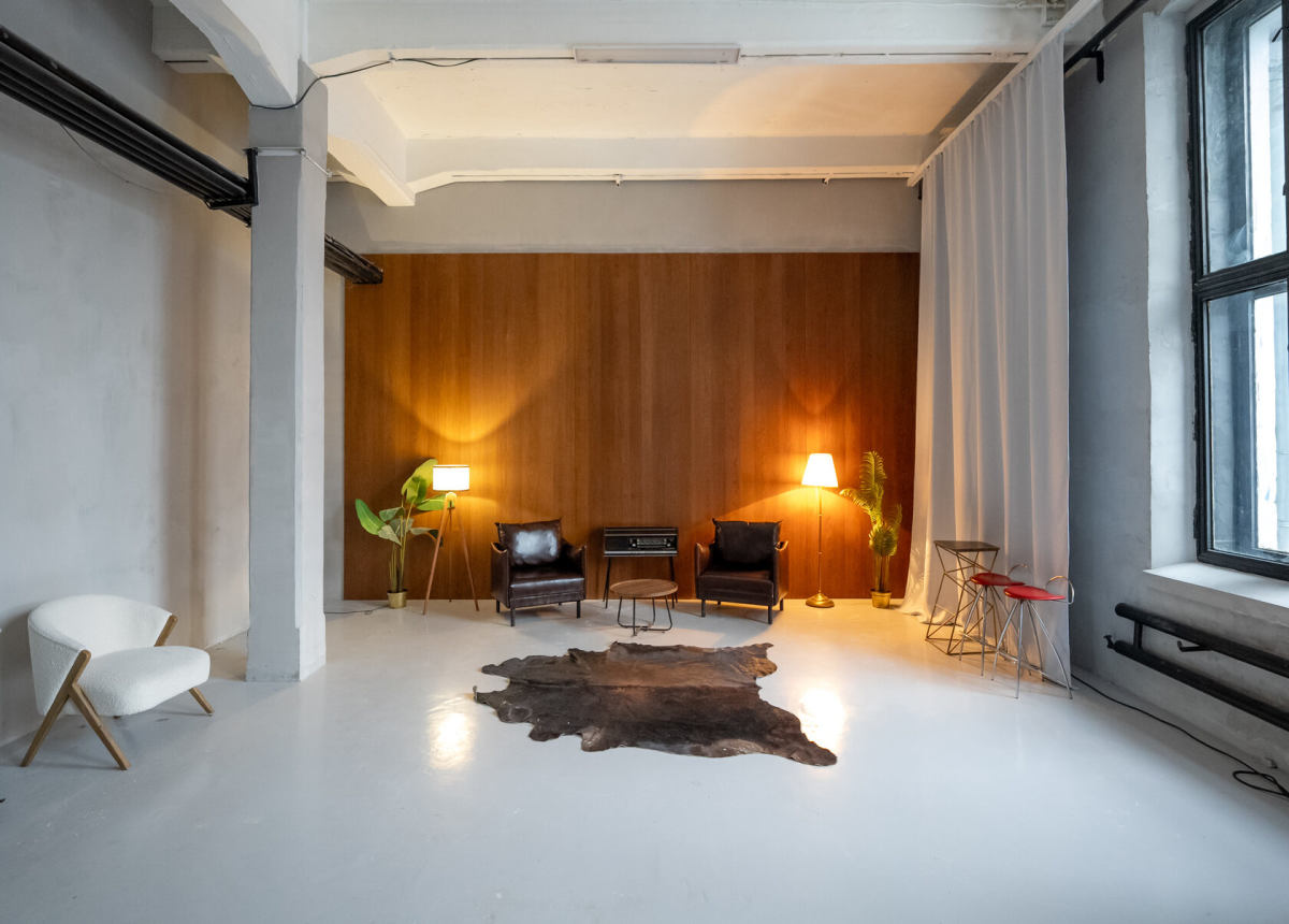СКАНДИ — светлый минималистичный зал площадью 53 квадратных метра в скандинавском стиле. Две деревянные акцентные стены и серая бетонная фактура создают стильный фон, большие окна дают мягкий естественный свет, а кресла и лаконичная мебель отлично дополняют интерьер. Идеален для портретной съемки,
