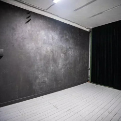 Одна стена белая, другая серая. На белой находится офисное пространство. Напротив фактурная черная стена, которая идеально подойдет для съемок актерского портфолио и портретов.