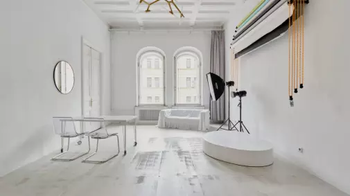 Светлый солнечный зал с уникальной круговой циклорамой, подвесной потолочной системой, профессиональным фото видео оборудованием, панорамными окнами, графитовой стеной, эксклюзивными фотозонами и разнообразным реквизитом.