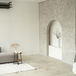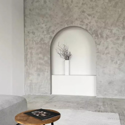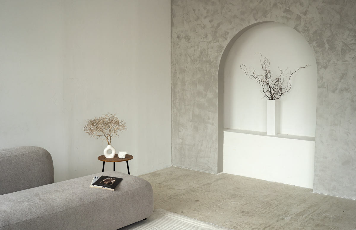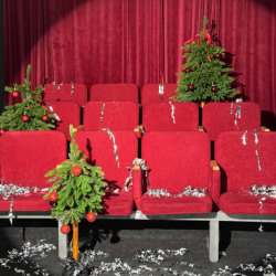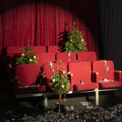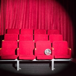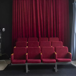 Зал с декорацией кинотеатра (3 ряда по 4 кресла, интерьер минимализм (диван, арка), бумажные фоны
