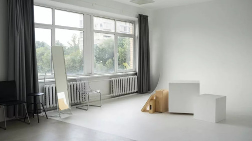 Светлый зал 50 м2 с белоснежной циклорамой 5м х 5м, 1/3 часть пола в зале серый бетон. В зале мягкий рассеянный свет даже в пасмурную погоду.