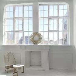 Белый зал с угловой циклорамой, огромные окна, прямой солнечный свет с утра до вечера.