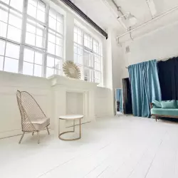 Просторный белый зал с циклорамой, металлическими фактурами и зоной для записи интервью и подкастов с возможностью арендовать микрофоны и микшер.