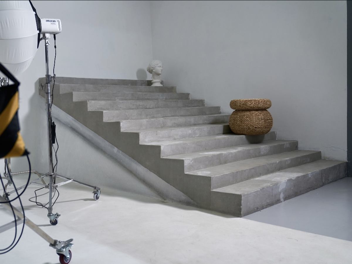 Угловая циклорама 5х5, интерьерная стена с серым полом и мебелью, и угол с большой бетонной лестницей.