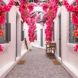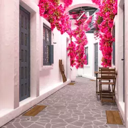 САНТОРИНИ — свет, вдохновение, контраст белой архитектуры и бугенвиллий.