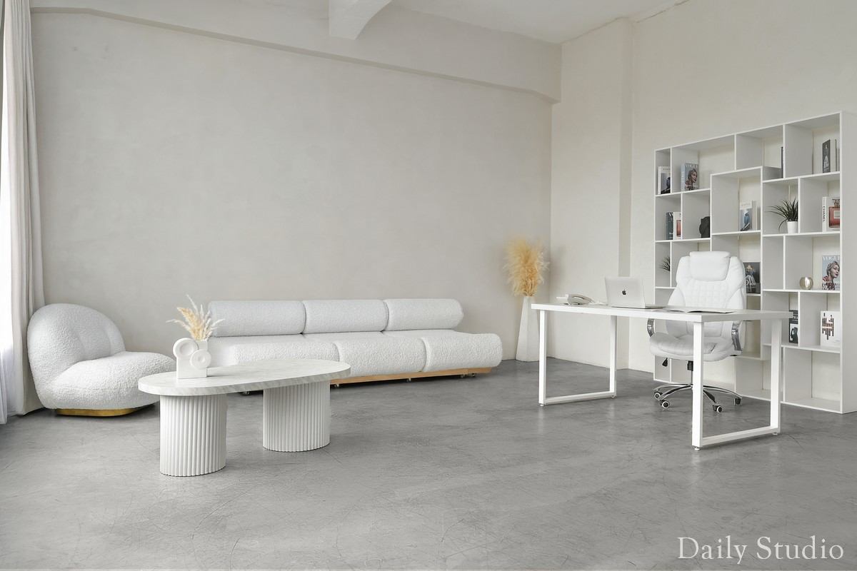 Творческое пространство с разными локациями.. белая с обрамлением, серая фактурная, растительная искусственная, кухня с большой столешницей.