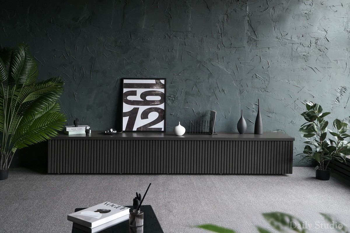 Новый зал в серых тонах, стильная мебель, минимализм.