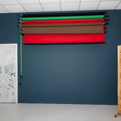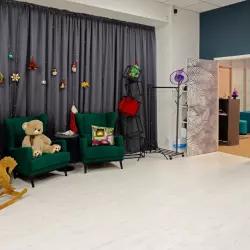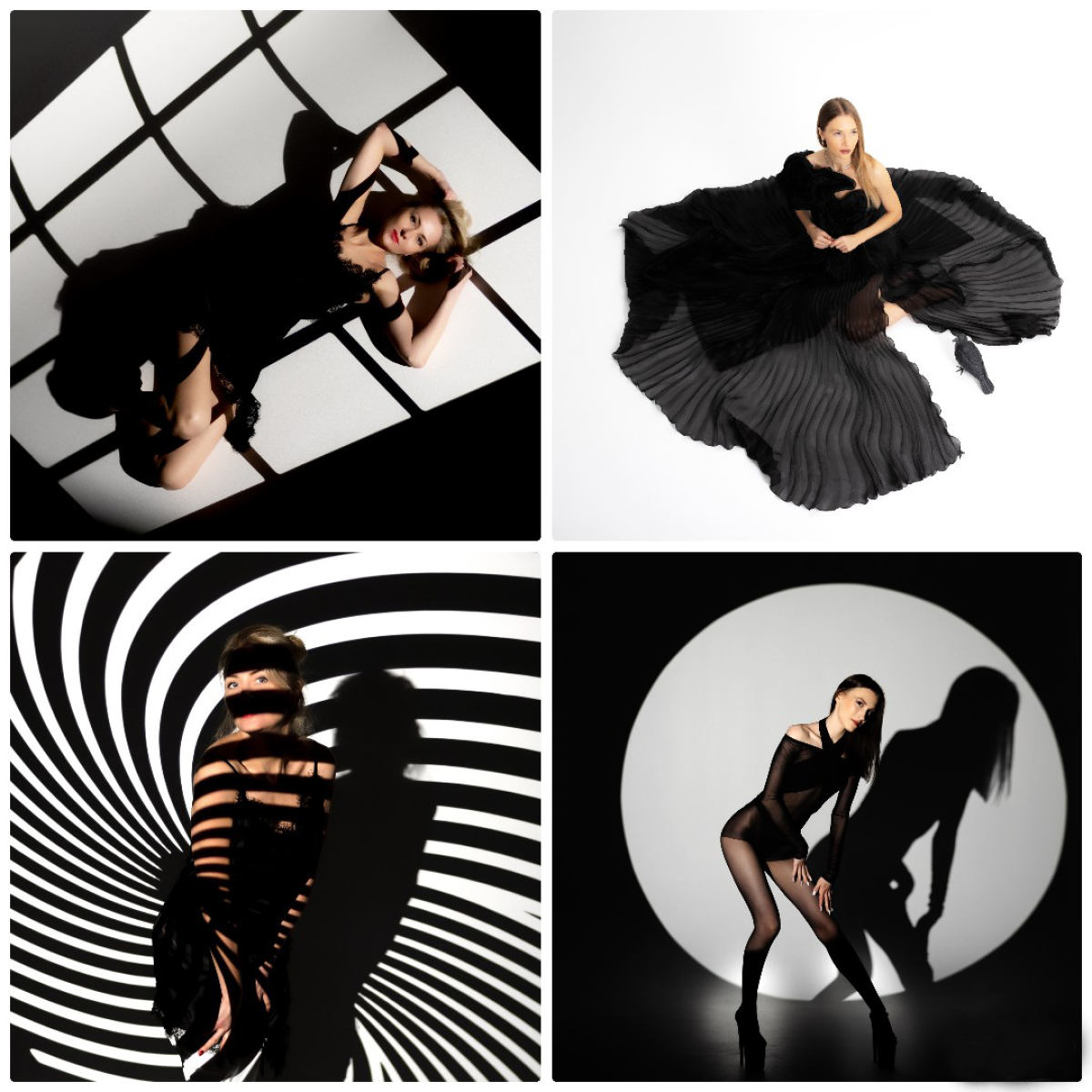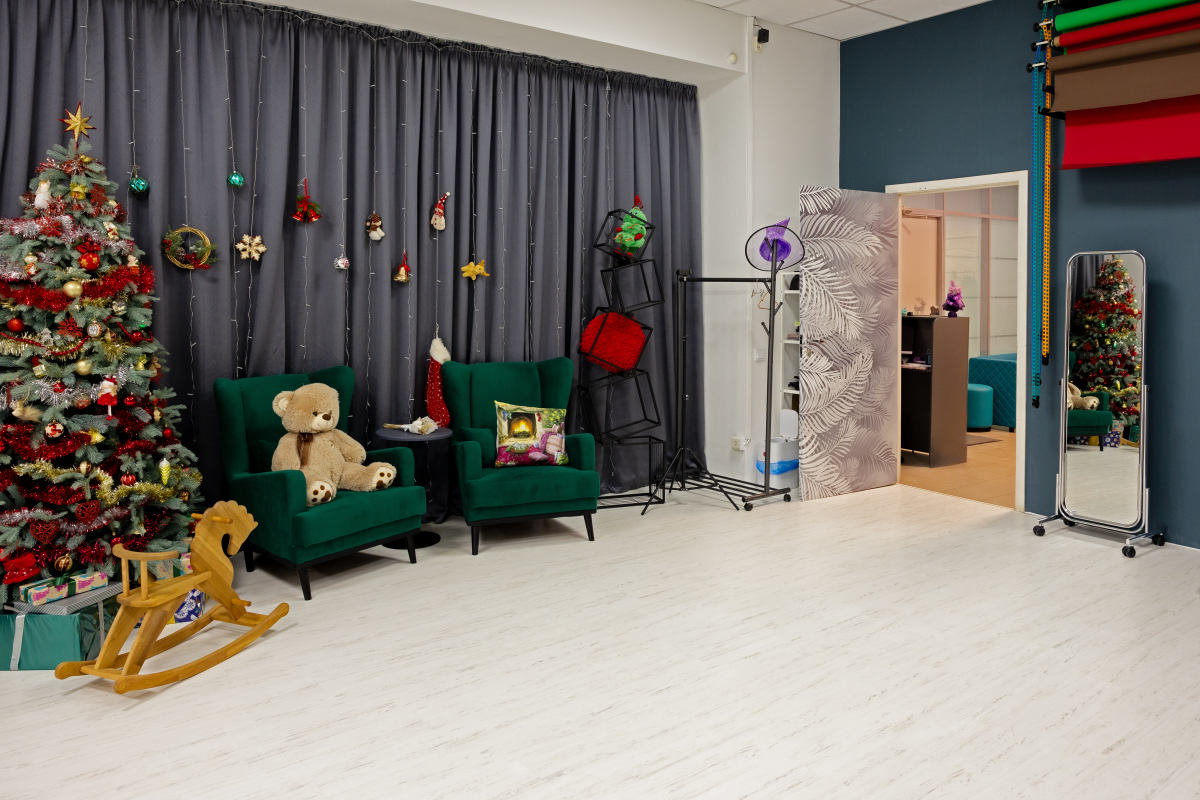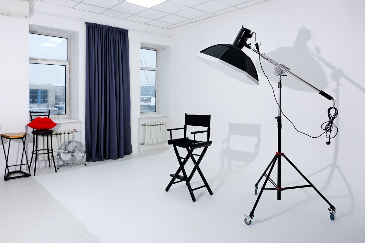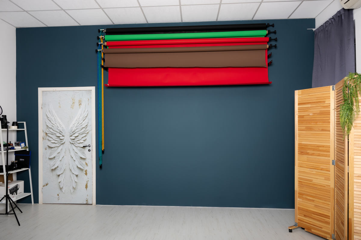 Две циклорамы чёрная и белая, точки подвеса над циклорамами, импульсный свет: пять источников Profoto D1 500 Air, постоянный свет: два источника Godox серии SL100 (по умолчанию стоят с софтбоксами), фоновая система, естественный свет, камерная гримёрка